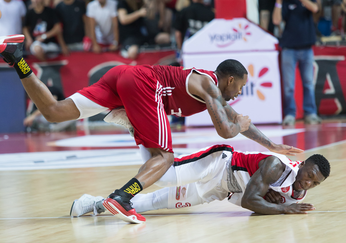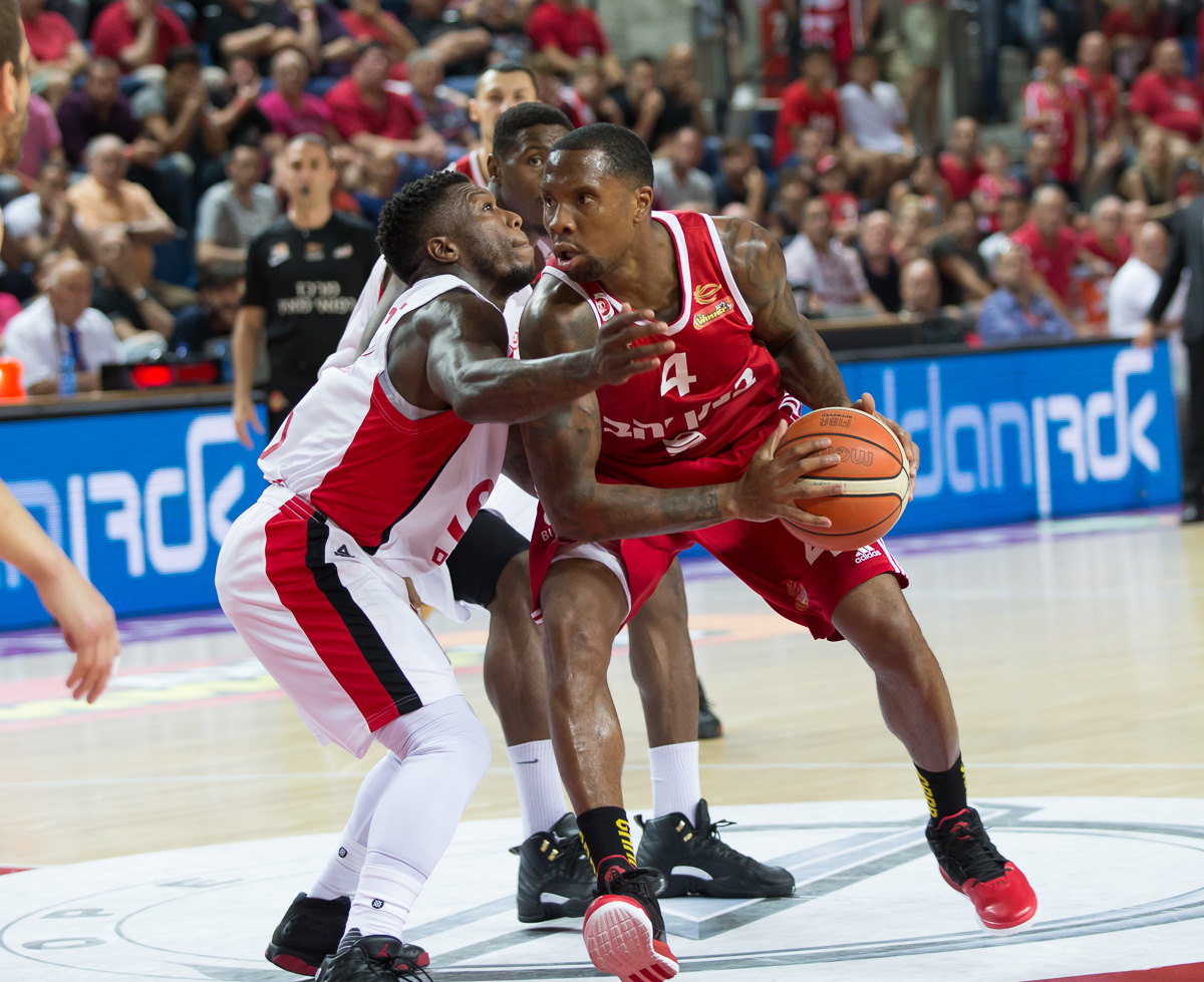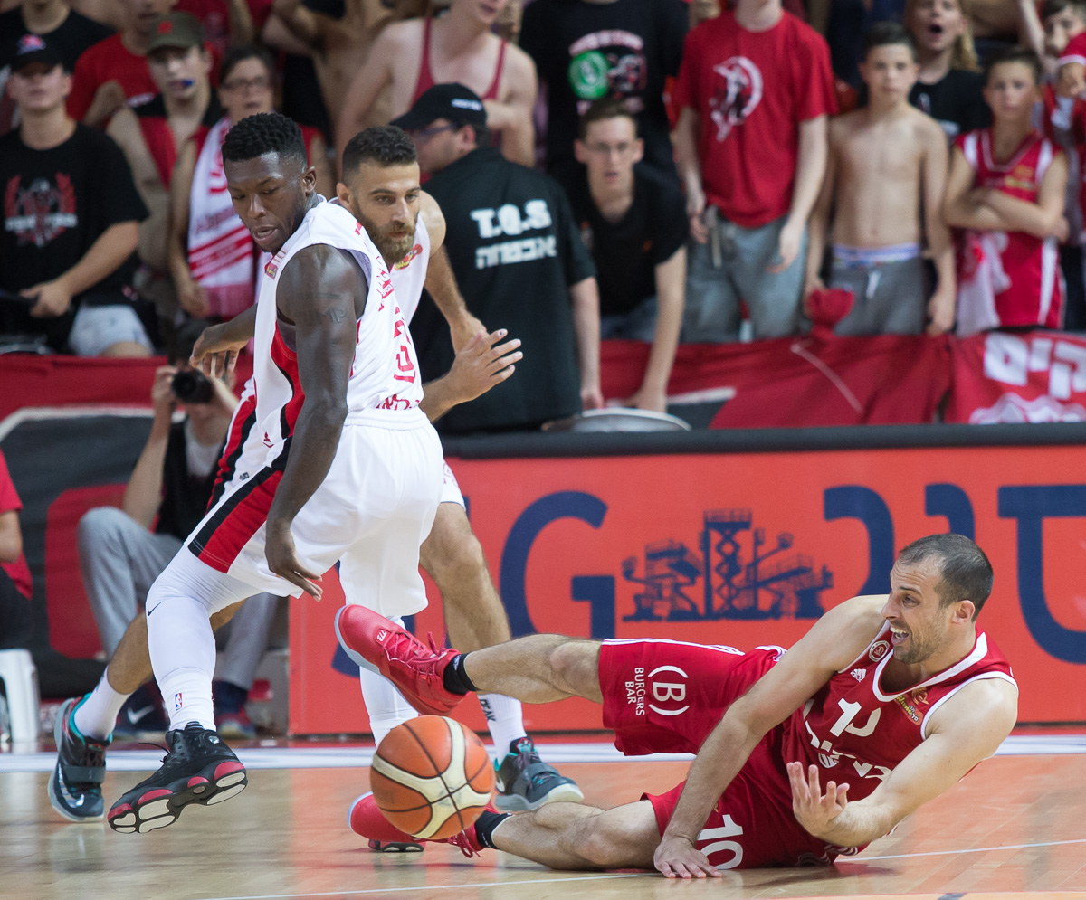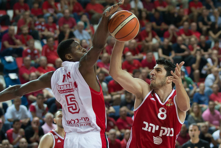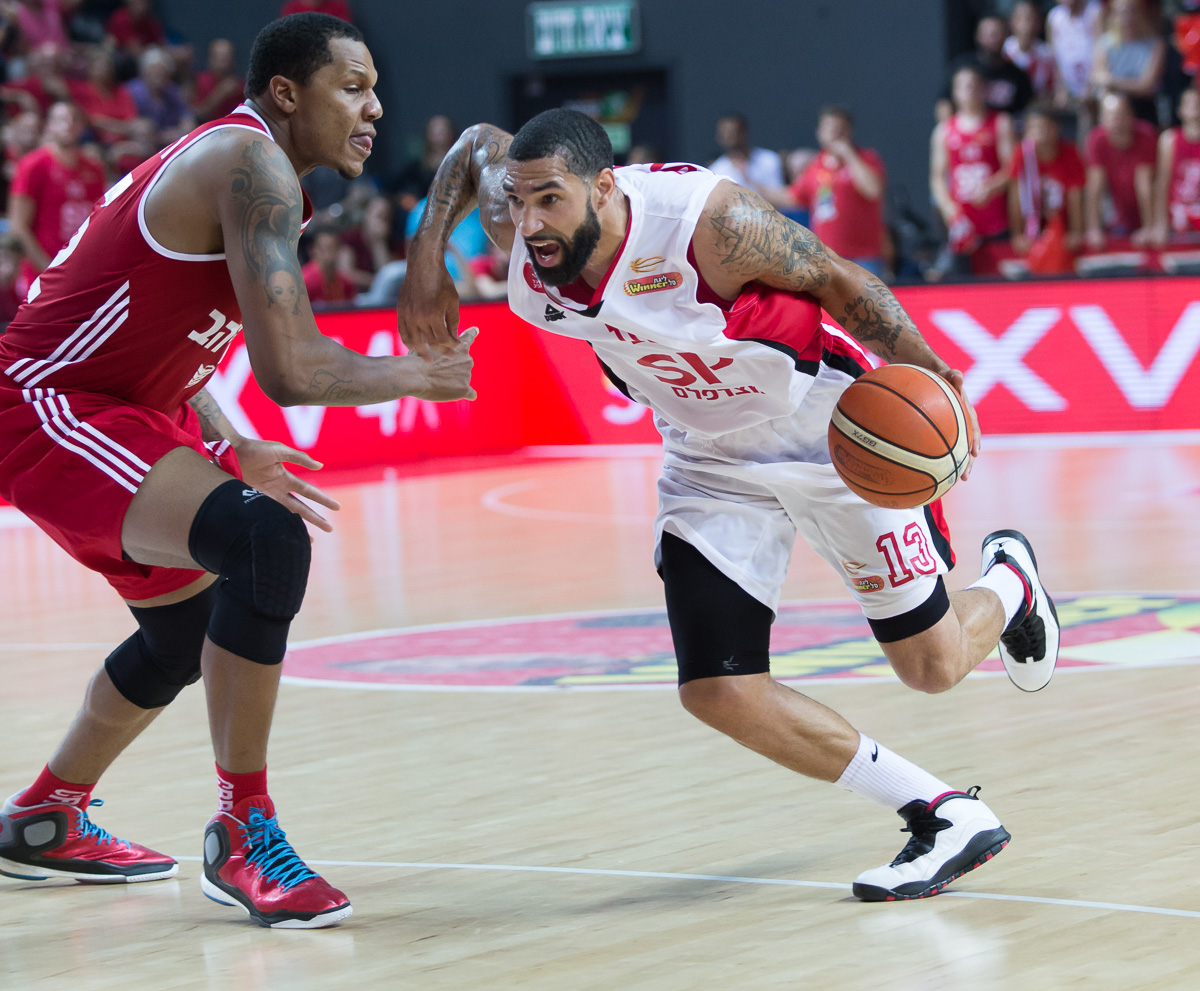 רובינסון ורולנד בקרב על הפרקט. שוויון 1:1 בסדרה (צילום: עודד קרני)