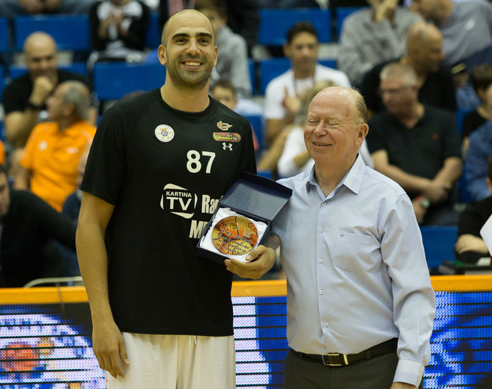 כדיר מקבל מהיו"ר פרי מגן על כניסתו לרשימת 100 הקלעים הגדולים בתולדות הליגה (צילום: עודד קרני)
