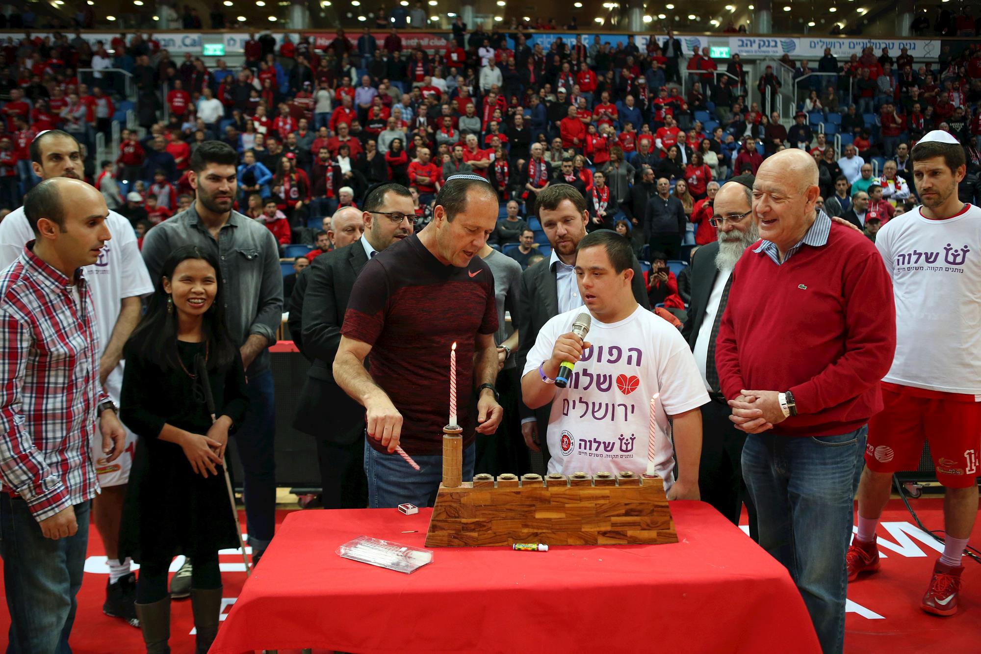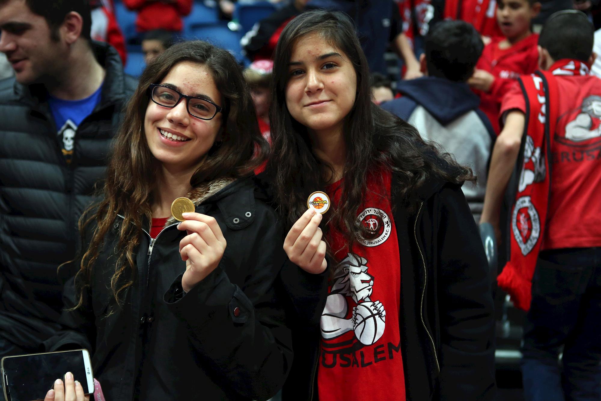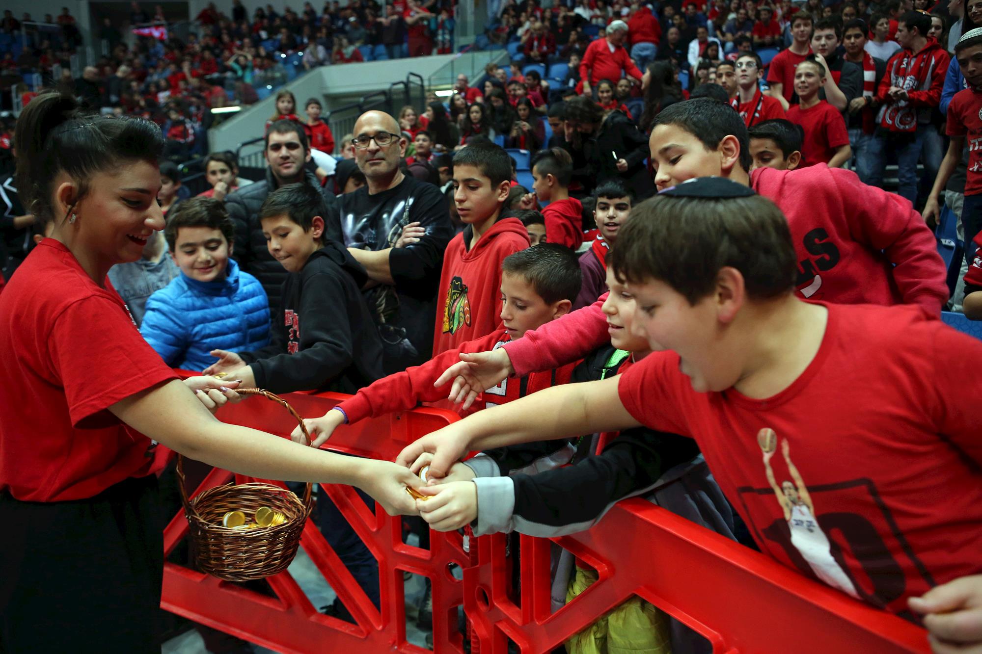 הקהל הירושלמי נהנה ממטבעות השוקולד, שי לחג ממנהלת הליגה (צילום: אודי ציטיאט)