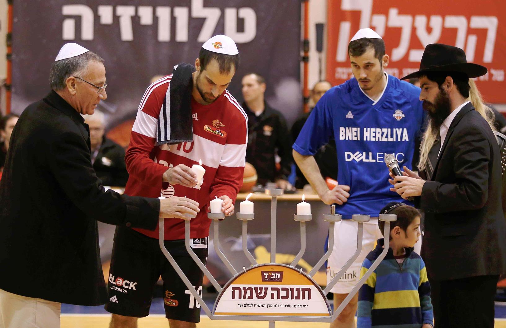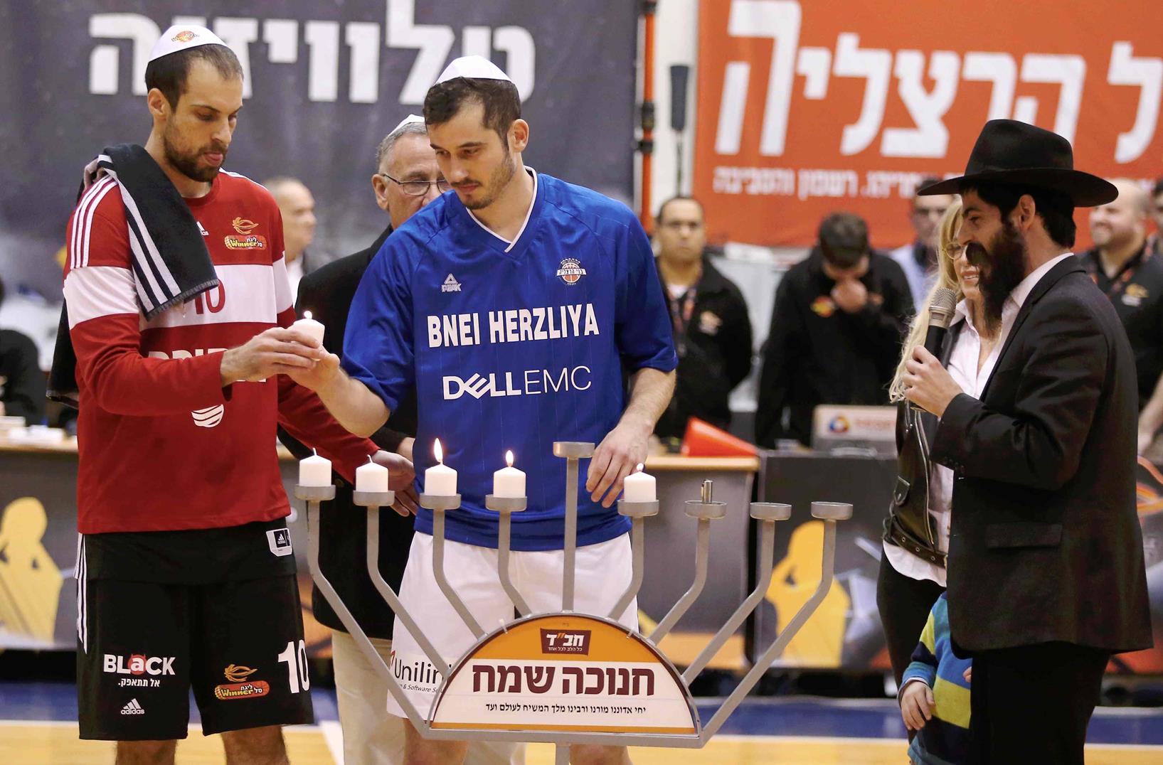 הקפטנים זליקוביץ' והלפרין מדליקים את הנרות לפני המשחק (צילום: אלן שיבר)