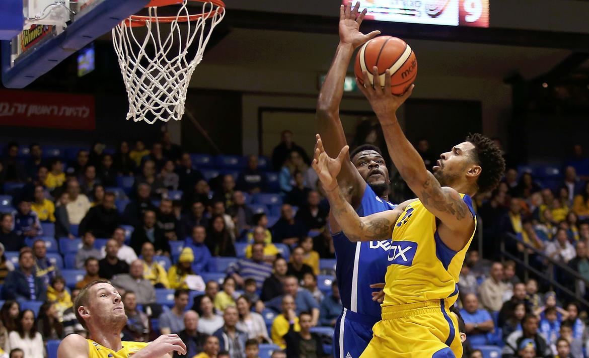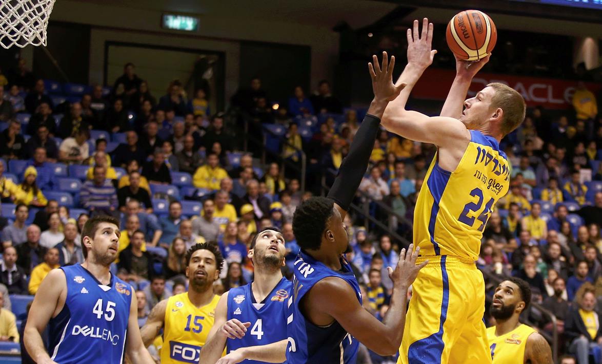 לנדסברג מנסה לקלוע מעל אדריאן (צילום: אלן שיבר)