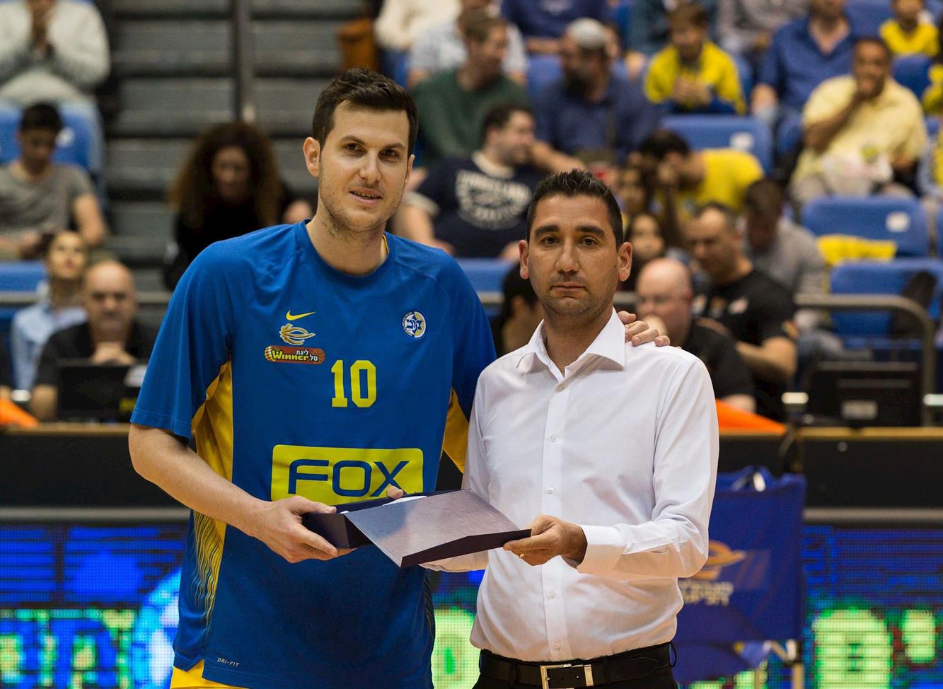 עמי ביטון מעניק לגיא פניני מגן על הגעתו ל-3,000 נקודות בליגת ווינר סל (צילום: עודד קרני)