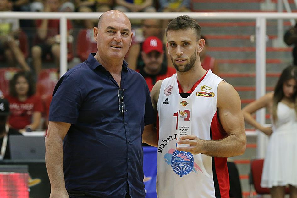 הבעלים אוחיון מעניק לסקוורר תשורה על הגעתו ל-1,000 נק' בליגת ווינר סל (צילום: לילך וייס)