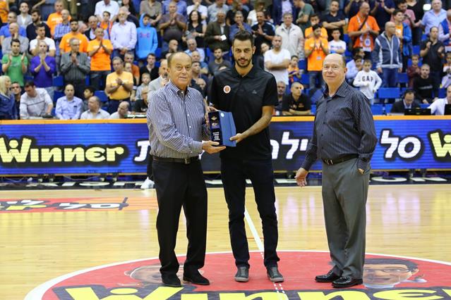 בן שימול מקבל תשורה על הגעתו ל-2,000 נקודות מרענן כץ (צילום: לירון מולדובן)