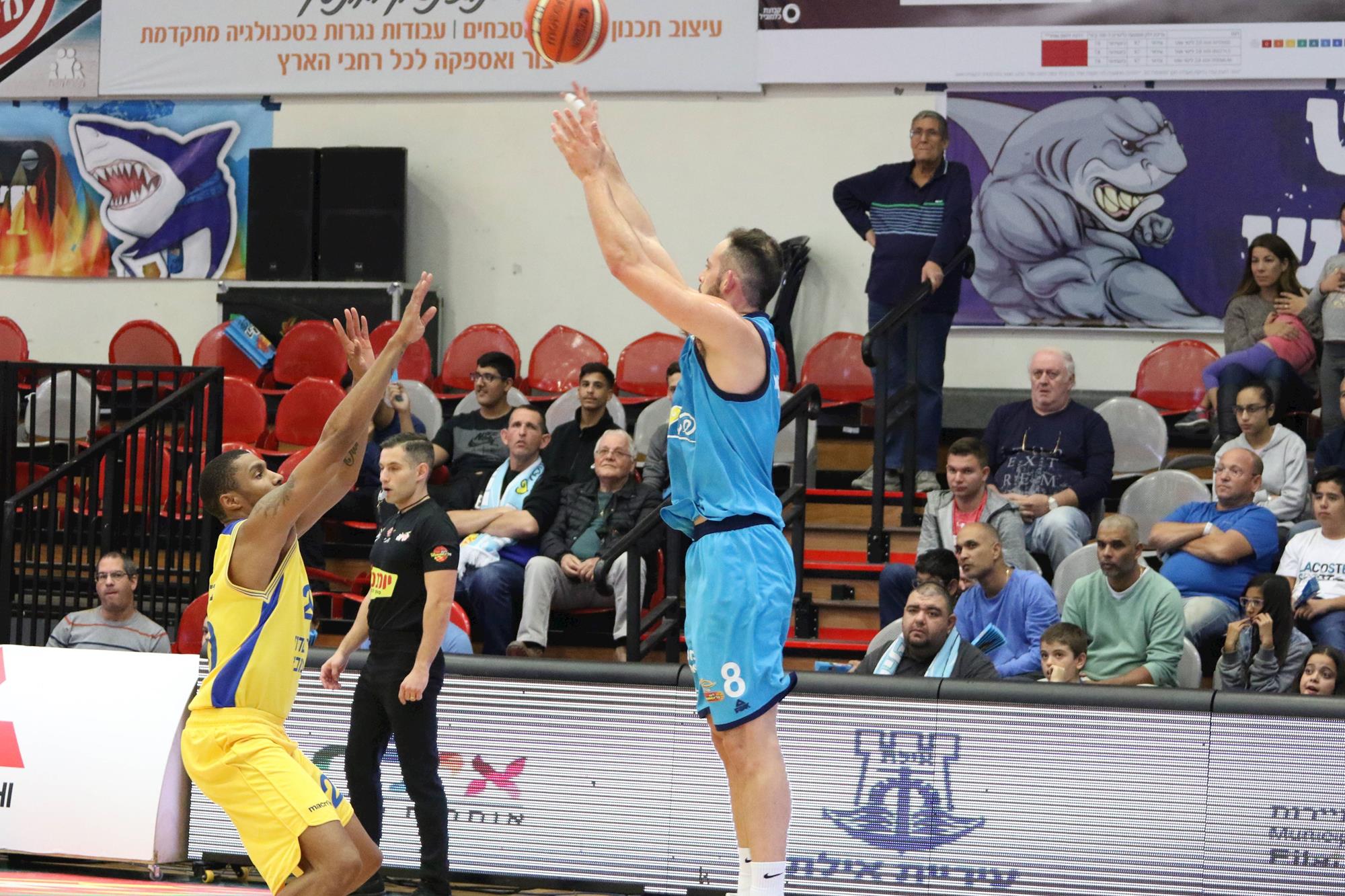 עמית שמחון להט מעבר לקשת והוביל את הפועל "פתאל" אילת לניצחון בכורה העונה באולם בגין, 76:86 על מכבי אשדוד/באר טוביה (צילום: פרנסיסקו די סטסיו)