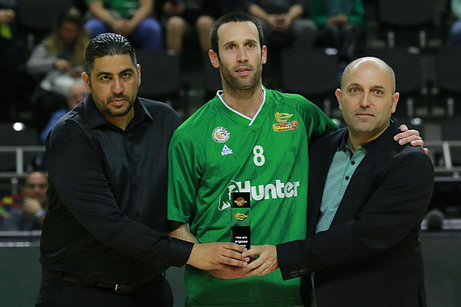 יבזורי מקבל מגן על הגעתו ל-2000 נקודות מהמנכ"ל רוזנבלט והמאמן רחימי (צילום: לילך וייס)