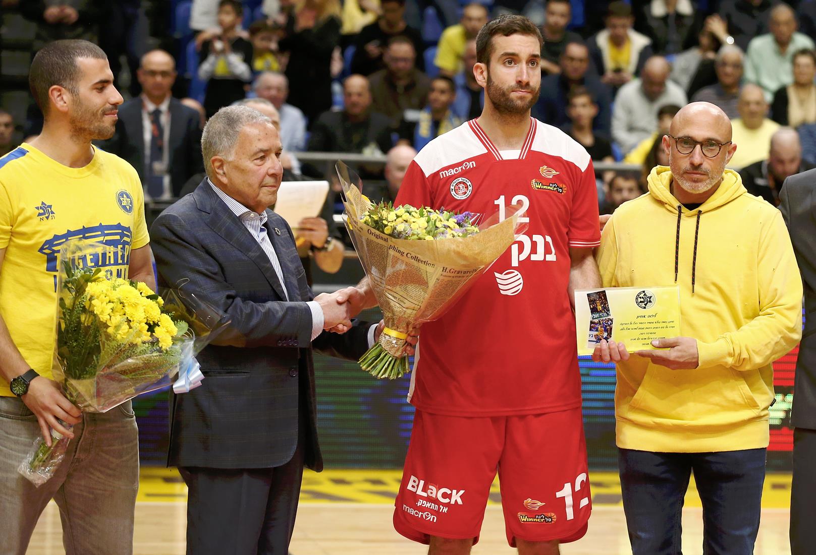 אוחיון מקבל פרחים מקבוצתו בשש השנים הקודמות (צילום: אלן שיבר)