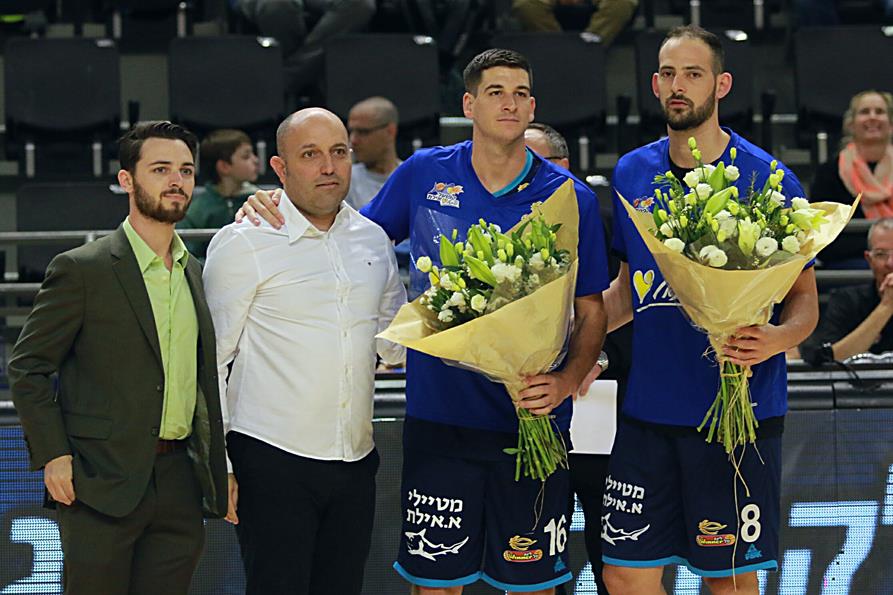 שמחון ובורדיון מקבלים פרחים מקבוצתם הקודמת (צילום: לילך וייס)