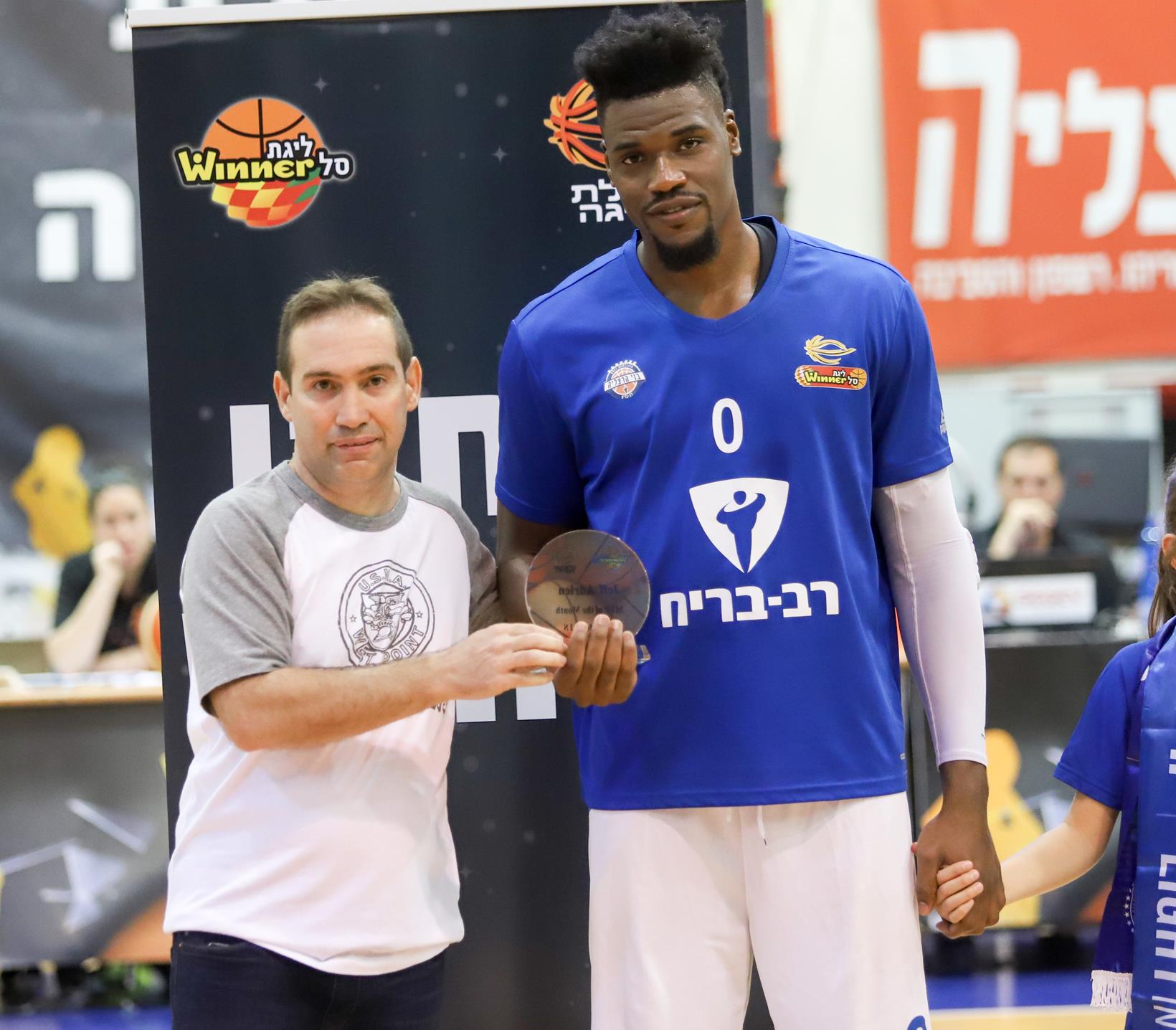 אדריאן מקבל מהיו"ר אקוניס את תואר שחקן החודש (צילום: דני מרון)