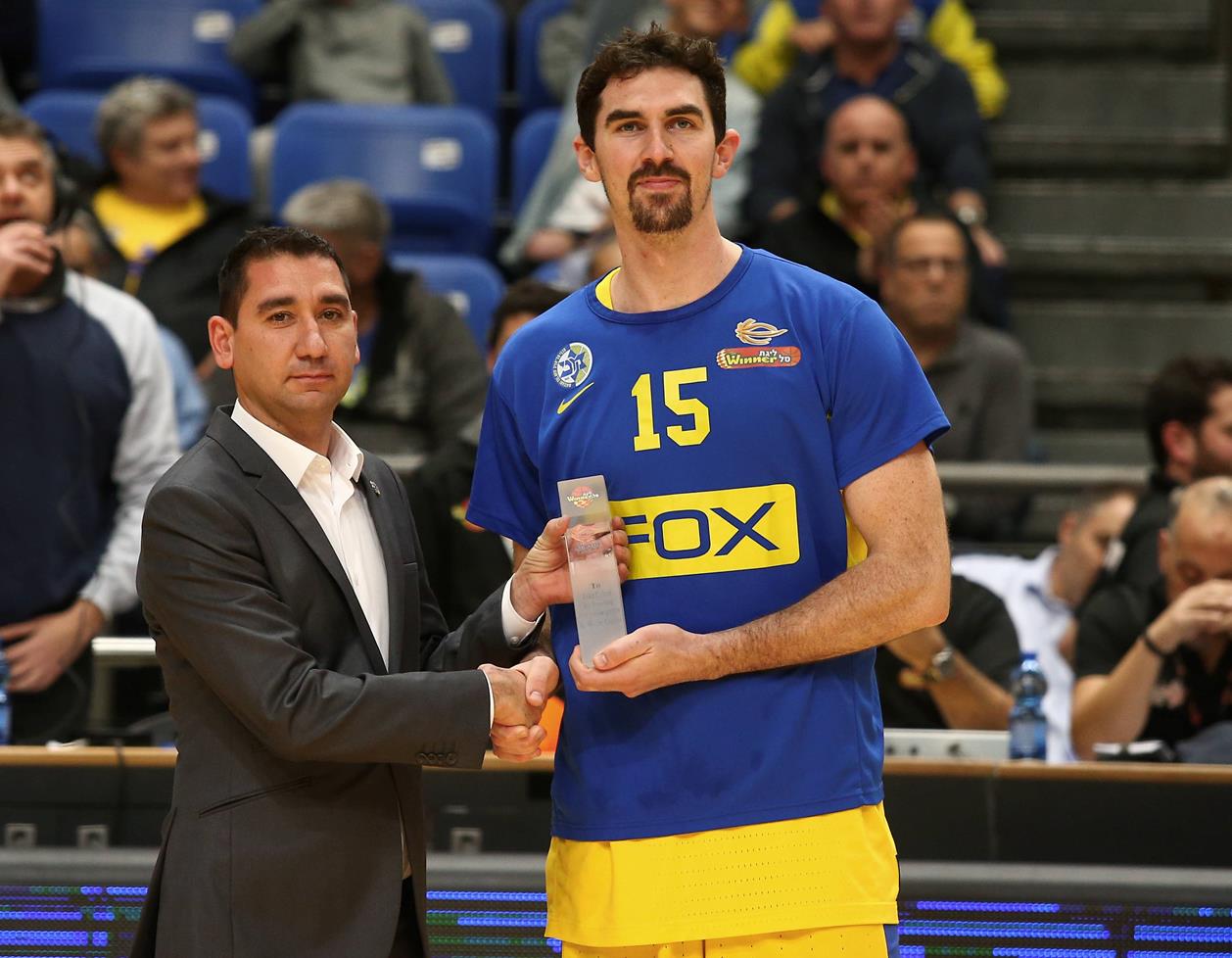 ג'ייק כהן מקבל מהמנהל עמי ביטון מגן על הגעתו ל-1,000 נקודות (צילום: אלן שיבר)