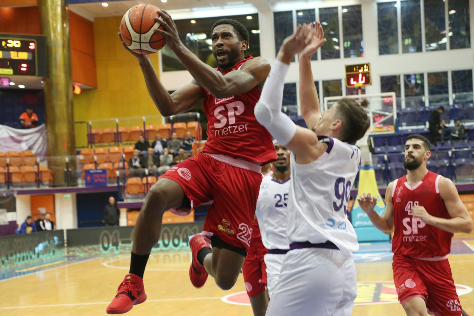 הפועל "SP מצר" ת"א שוב קלעה מצוין מבחוץ והשיגה את ניצחונה השישי משמונת המחזורים האחרונים, 59:80 בחוץ על עירוני נהריה. אמינו בלט (צילום: לילך וייס)