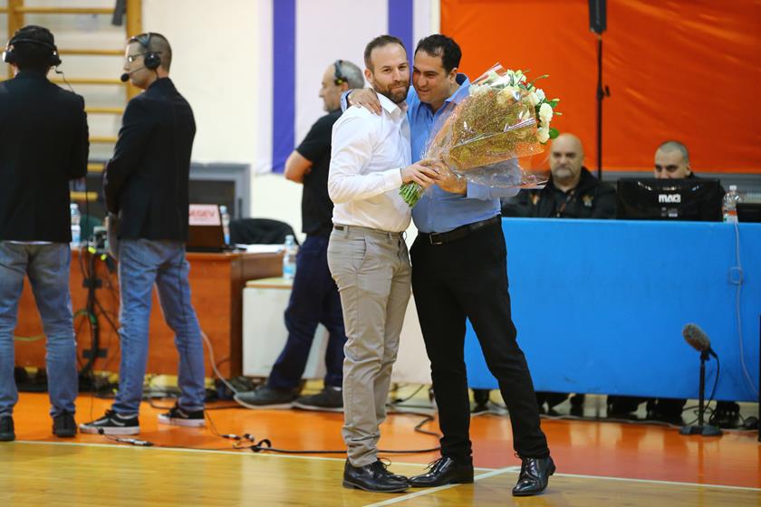 עוזר המאמן עמית שרף מתקבל בפרחים ע"י היו"ר יניב מזרחי (צילום: לירון מולדובן)