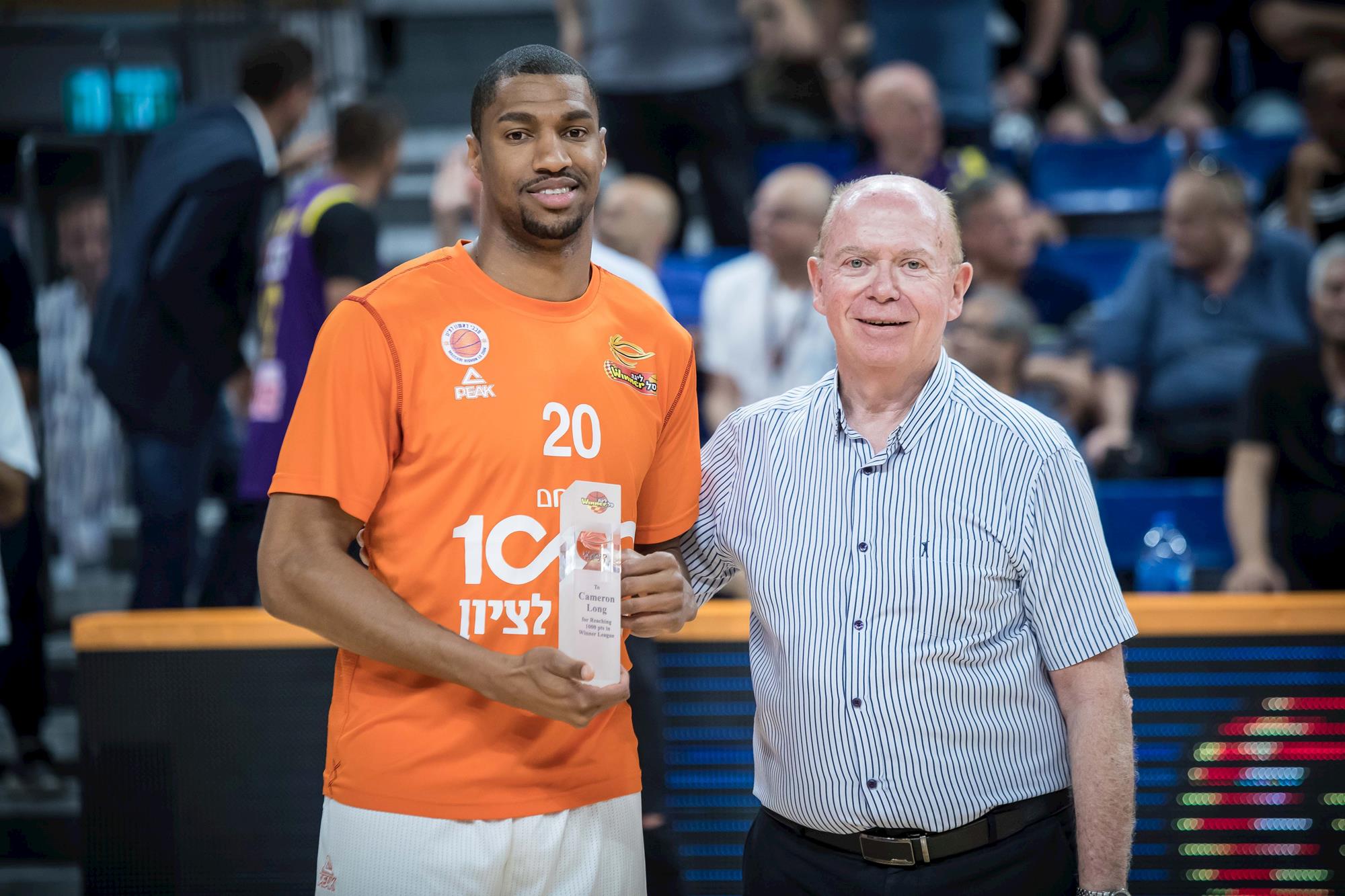 היו"ר פרי מעניק מגן ללונג על הגעתו ל-1,000 נקודות בליגה (צילום: עודד קרני)