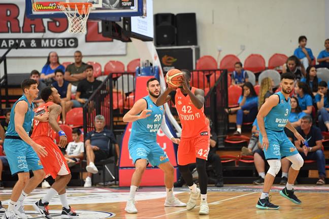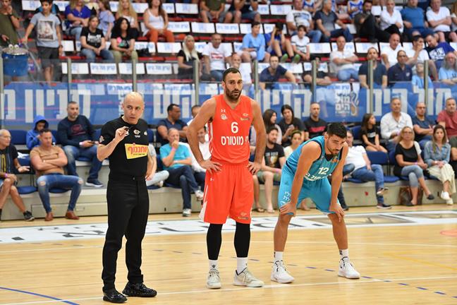 זלמנסון עובד עם הגב לסל מול דן (צילום: יוד צילומים)