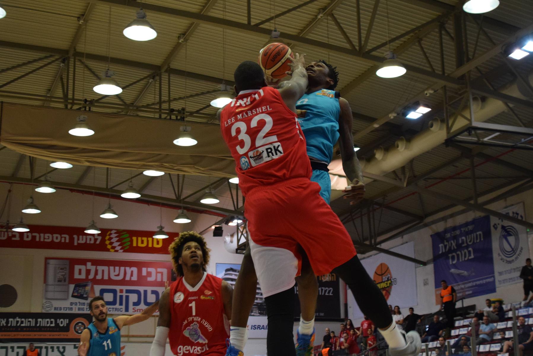 קליעת עונשין של תומפסון סידרה להפועל "יוסי אברהמי" אילת ניצחון בית דרמטי, 78:79 על הפועל גלבוע/גליל. שולדבראנד הצטיין (צילום: פרנסיסקו די סטסיו)