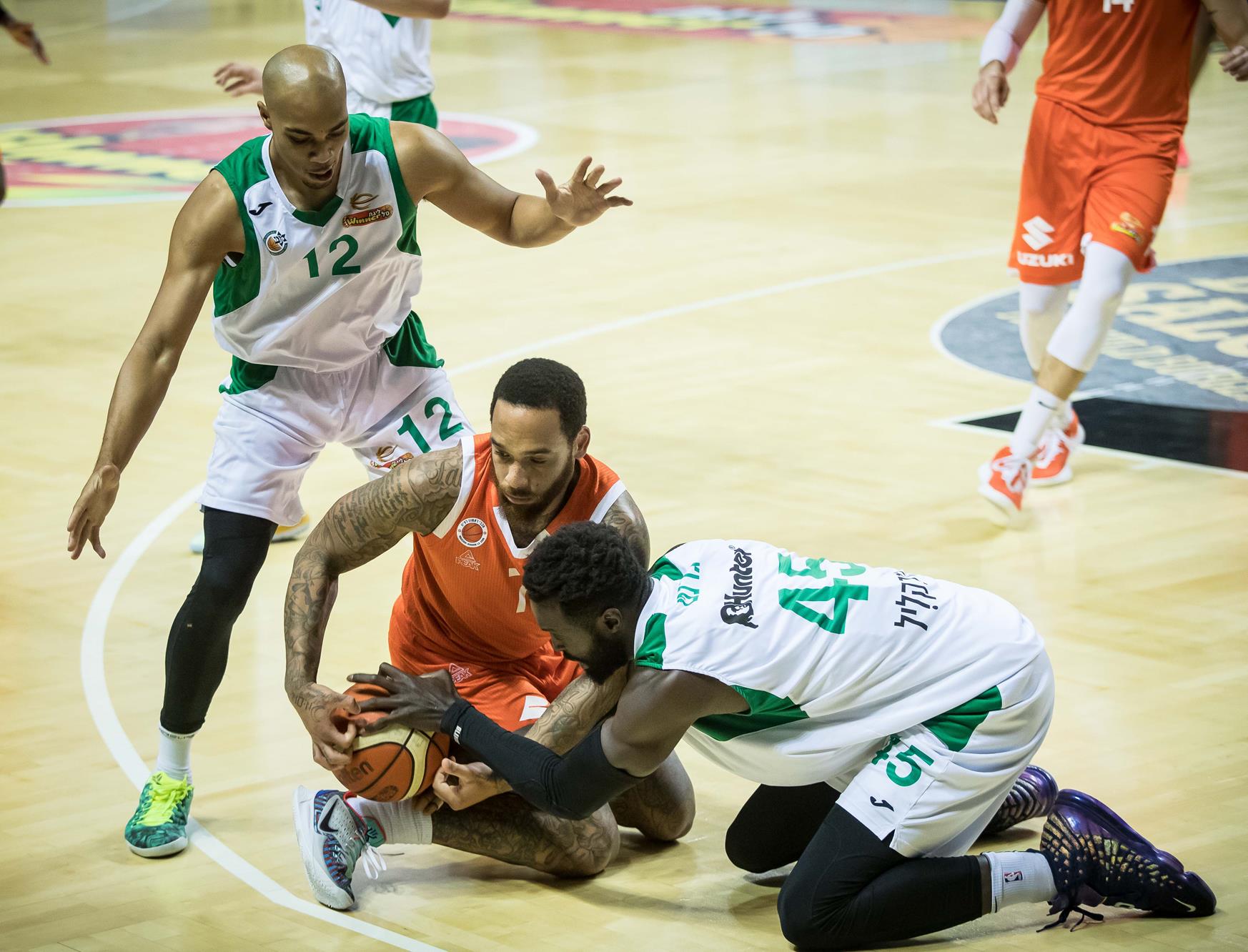 גרנט והריסון נאבקים על הפרקט (צילום: עודד קרני)
