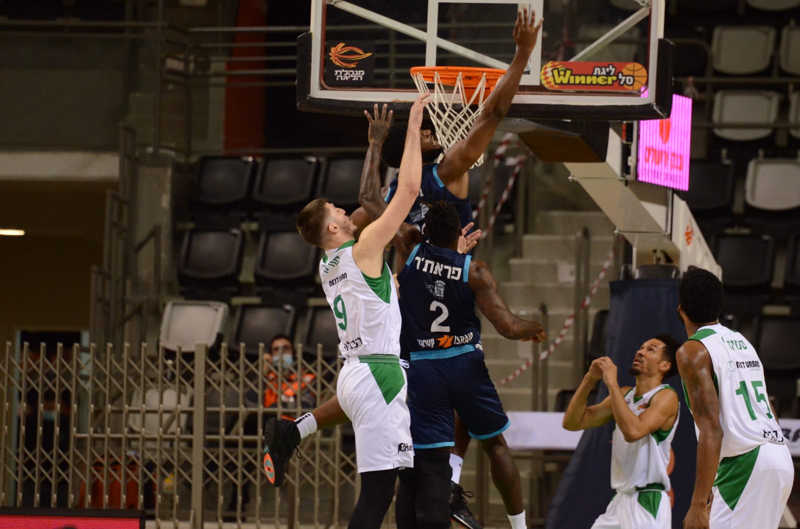 מייקל בריסקר דאג להעביר את היתרון לחיפה, אבל פראת'ר בשני סלים רצופים הפך חזרה, 23:24. קרטר עלה על הלוח, רגלנד קלע שלוש זריקות עונשין רצופות ושלשה של פראת'ר שלחה את דניאל סאואנה לפסק זמן בפיגור 32:25 באמצע הרבע השני. הירוקים נתקעו בהתקפה ועברו להתקדם באחדות, צוף בן משה ורגלנד לא עצרו וסל של ניבו מריבאונד התקפה קבע הפרש דו-ספרתי, 27:38. בריסקר צלף מבחוץ בהתקפה אחת וסחט עבירה בניסיון שלשה באחרת וסגר ריצת 0:6 פרטית, סמית' בסל ועבירה שלח את אריאל בית הלחמי לטיים אאוט משלו ובריסקר צימק לנקודה בלבד, 38:37 בהפסקה.