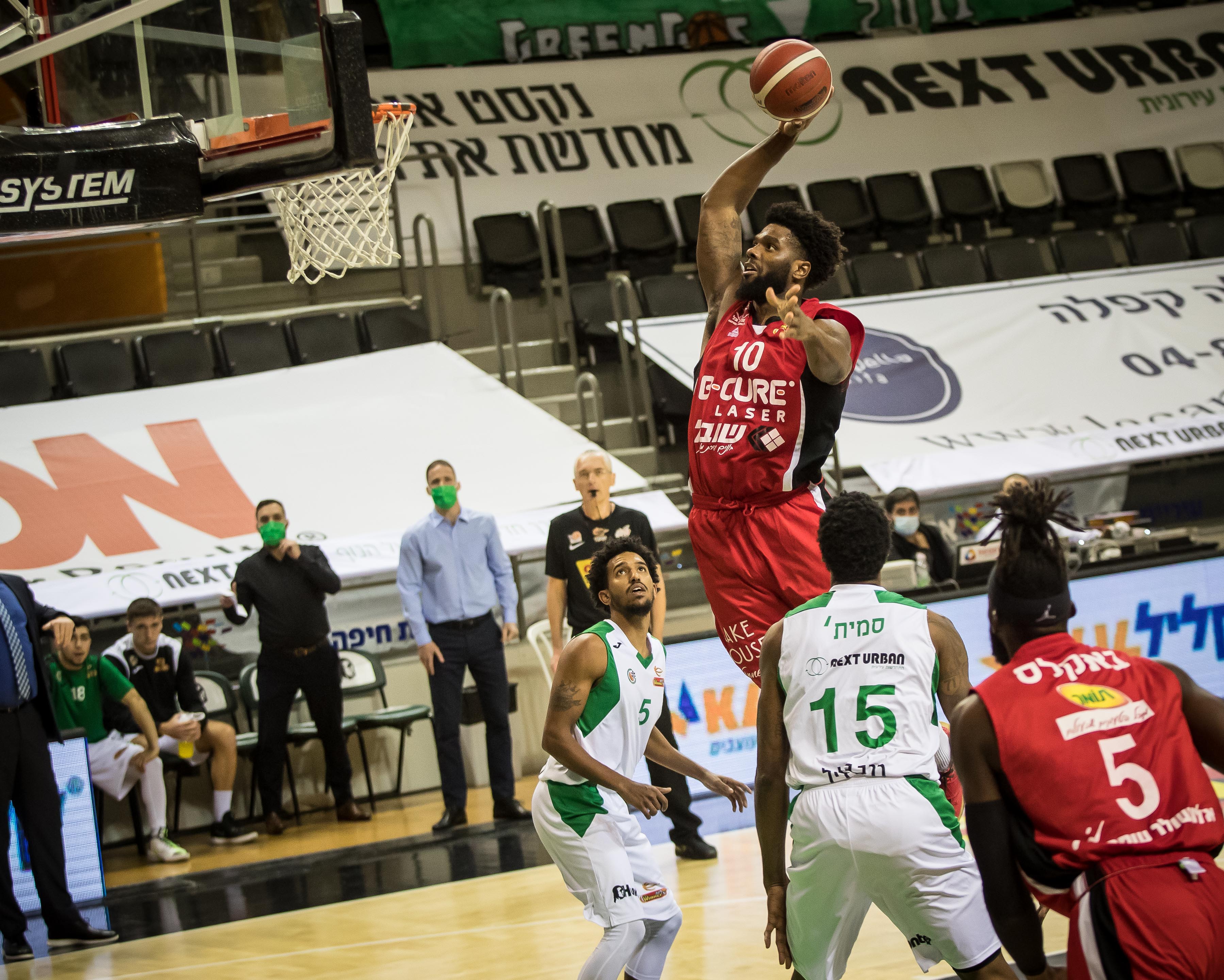הפועל "בי-קיור לייזר" חיפה התאוששה משלשת שוויון של בריסקר על הבאזר וגברה על מכבי חיפה 91:100 באחד המשחקים הגדולים של העונה (צילום: עודד קרני)