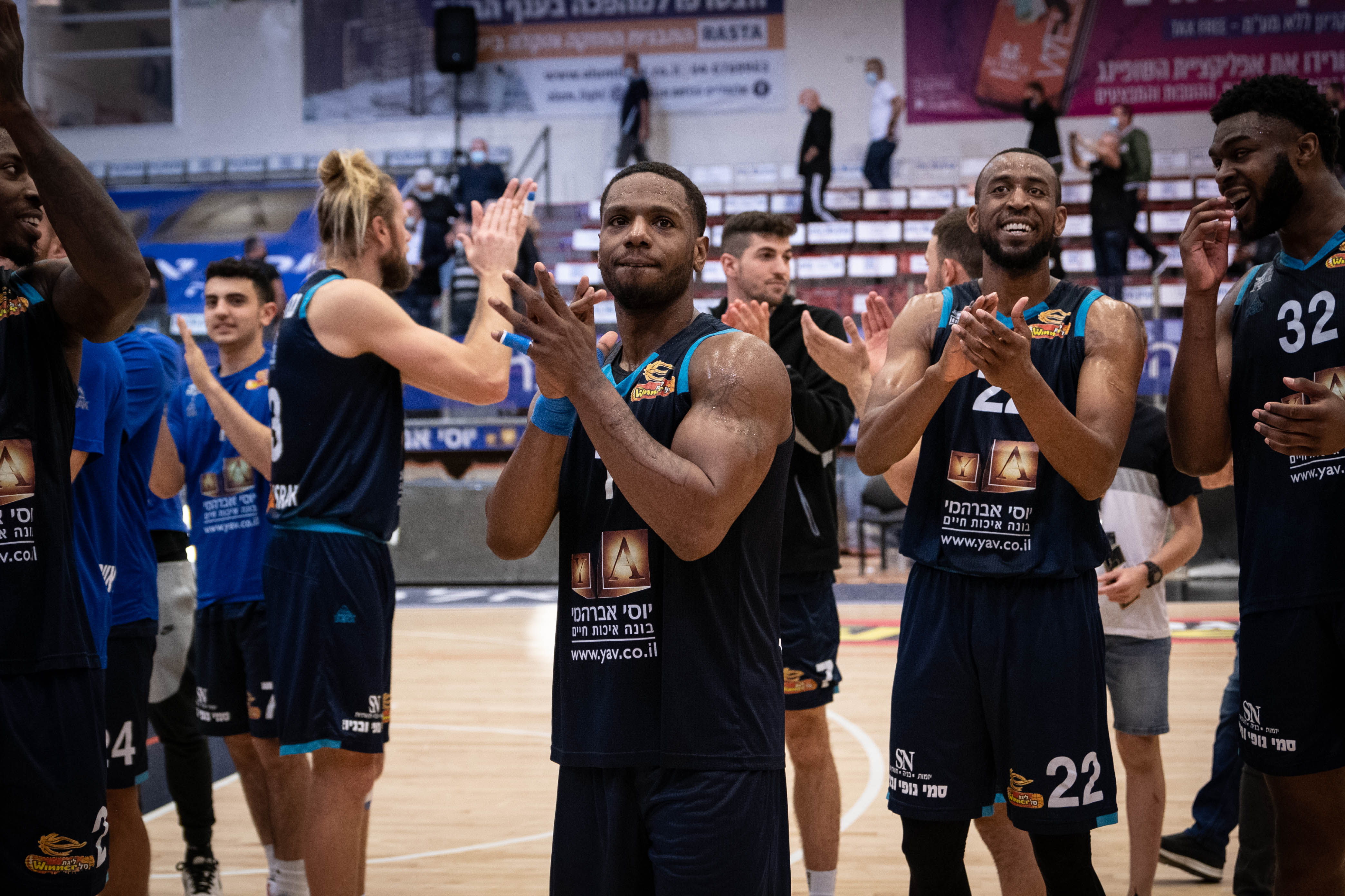הפועל "יוסי אברהמי" אילת נהנתה מעידוד אוהדיה לראשונה מזה שנה ועצרה את מכבי "Playtika" ת"א עם 85:91 בבגין. דאבל-דאבלים לרגלנד וניבו (צילום: רז גליל)