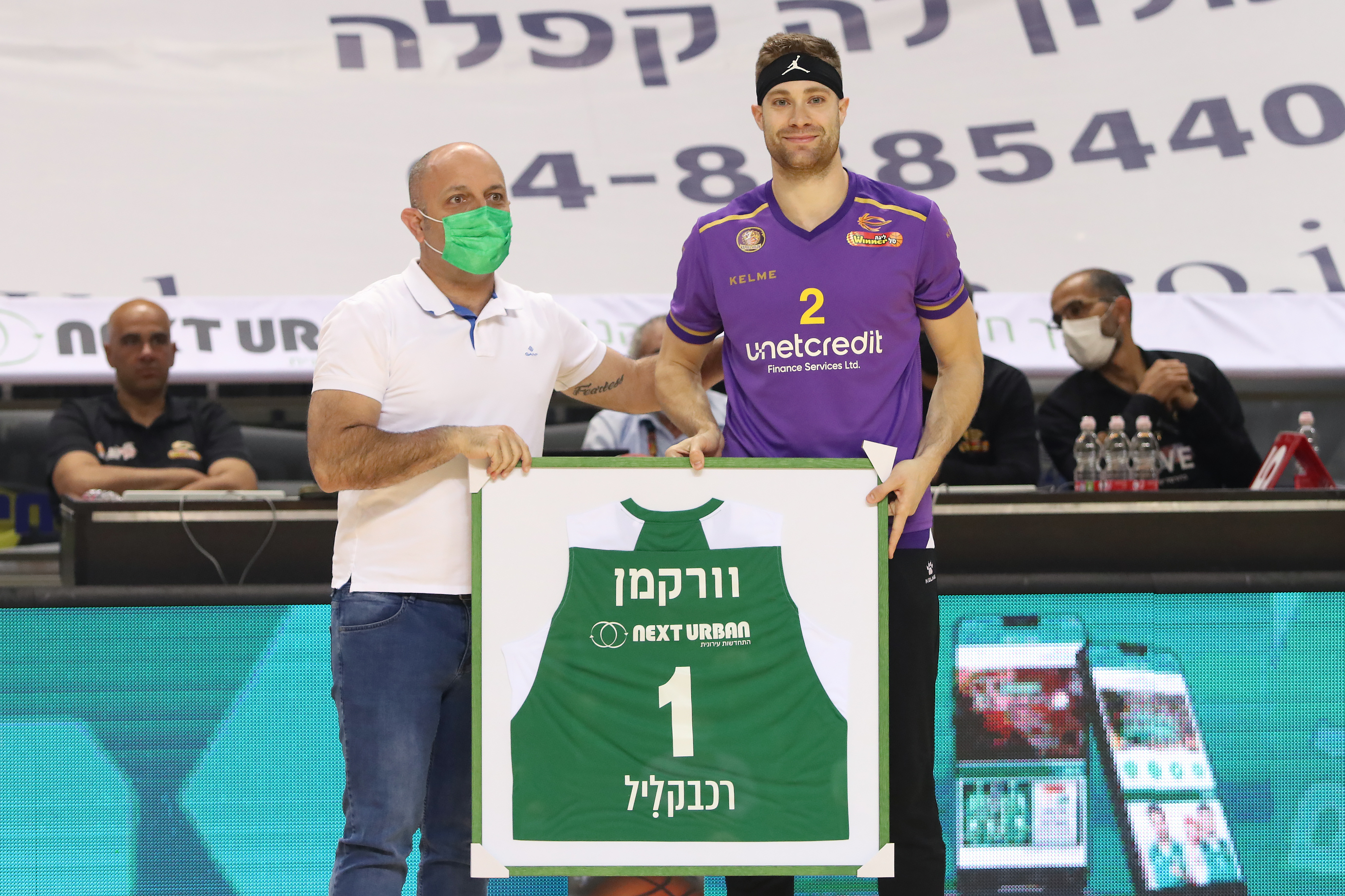 המנכ"ל רוזנבלט מעניק לוורקמן גופיה ממוסגרת (צילום: לילך וייס)