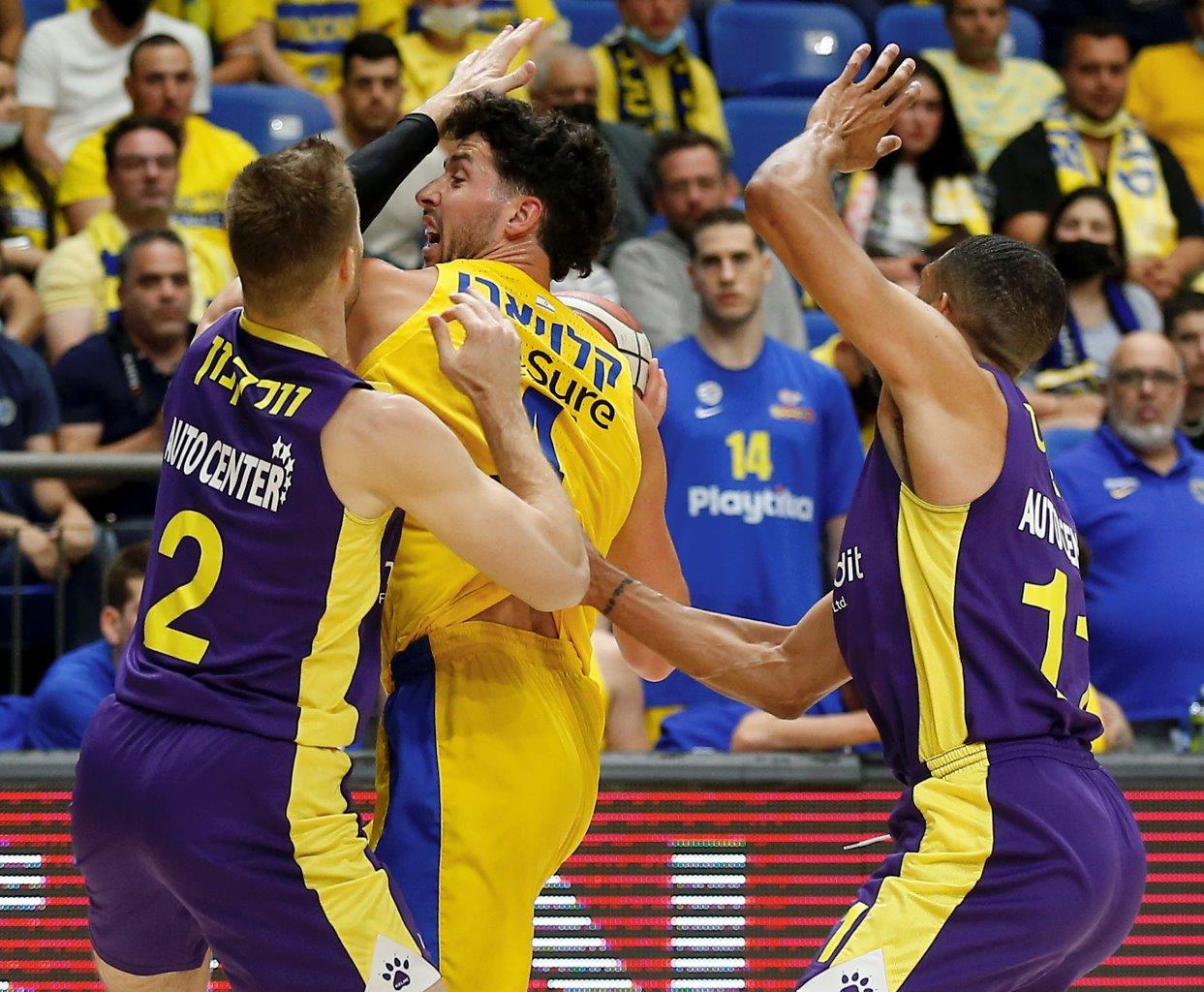 תצוגה הגנתית מרשימה נוספת של מכבי "Playtika" ת"א העניקה לה ניצחון בית 65:86 על הפועל "יונט קרדיט" חולון. ווילבקין וז'יז'יץ' שוב בלטו (צילום: אלן שיבר)