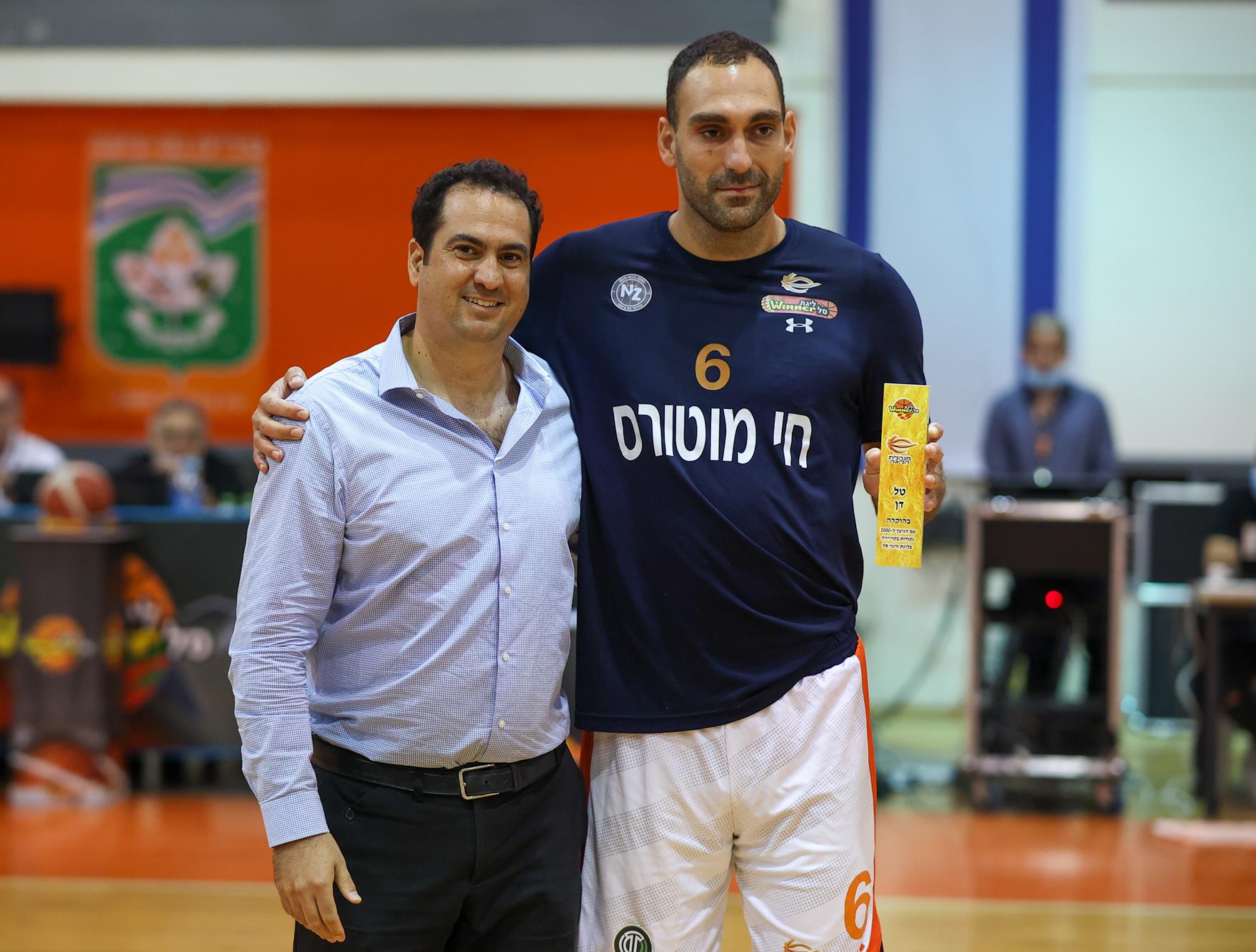 דן מקבל מהיו"ר מזרחי מגן לרגל הגעתו ל-2,000 נקודות בליגת ווינר סל (צילום: דני מרון)