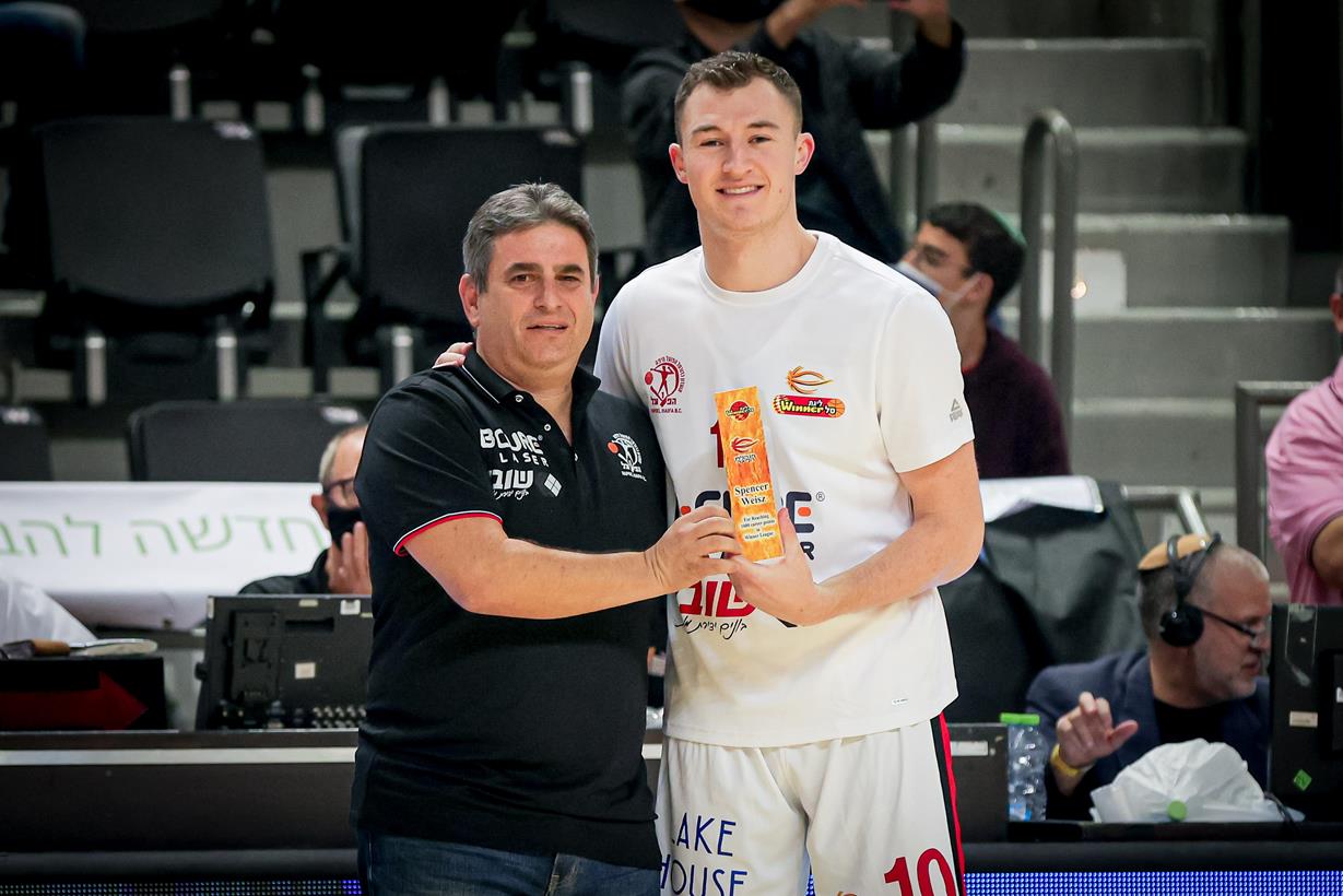 וייס מקבל מהמנכ"ל פלדהיים מגן על הגעתו ל-1,000 נקודות בליגת ווינר סל (צילום: מאור אלקסלסי)