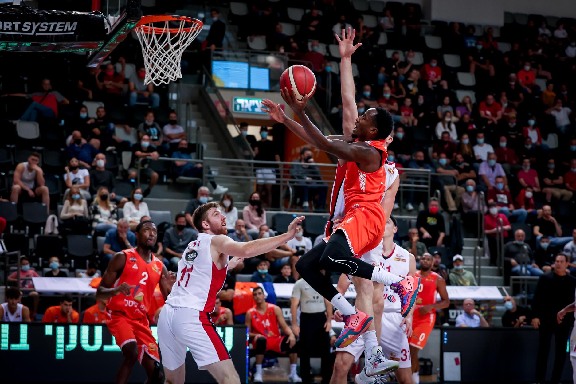 אופק אביטל חדר טוב לסל יפה, איגור קולשוב ענה לו מחצי מרחק וסל של דיים בצבע צימק ל-34:29 ושלח את אלעד חסין לדבר עם חניכיו. נתנאל ארצי הרגיש בנוח בטבעות האהובות עליו ברוממה וקבר שתי שלשות מהירות, ג'יימס עם רצף מהלכים גדולים כולל דאנק מרהיב מנע מהפך, 39:44. נסטרנקו הגיע כבר לדו-ספרתי, קלייברן שוב חימם מנועים בצד השני וצימק לנקודה בלבד, 48:47. ורגאס שבר שיא עונה באסיסטים עם החמישי שלו לג'יימס, הולוואי קלע בצד השני ושלשה של וייס קבעה 49:53. הולוואי שהגיע לספרות כפולות מהקו צימק ל-53:51 בהפסקה.