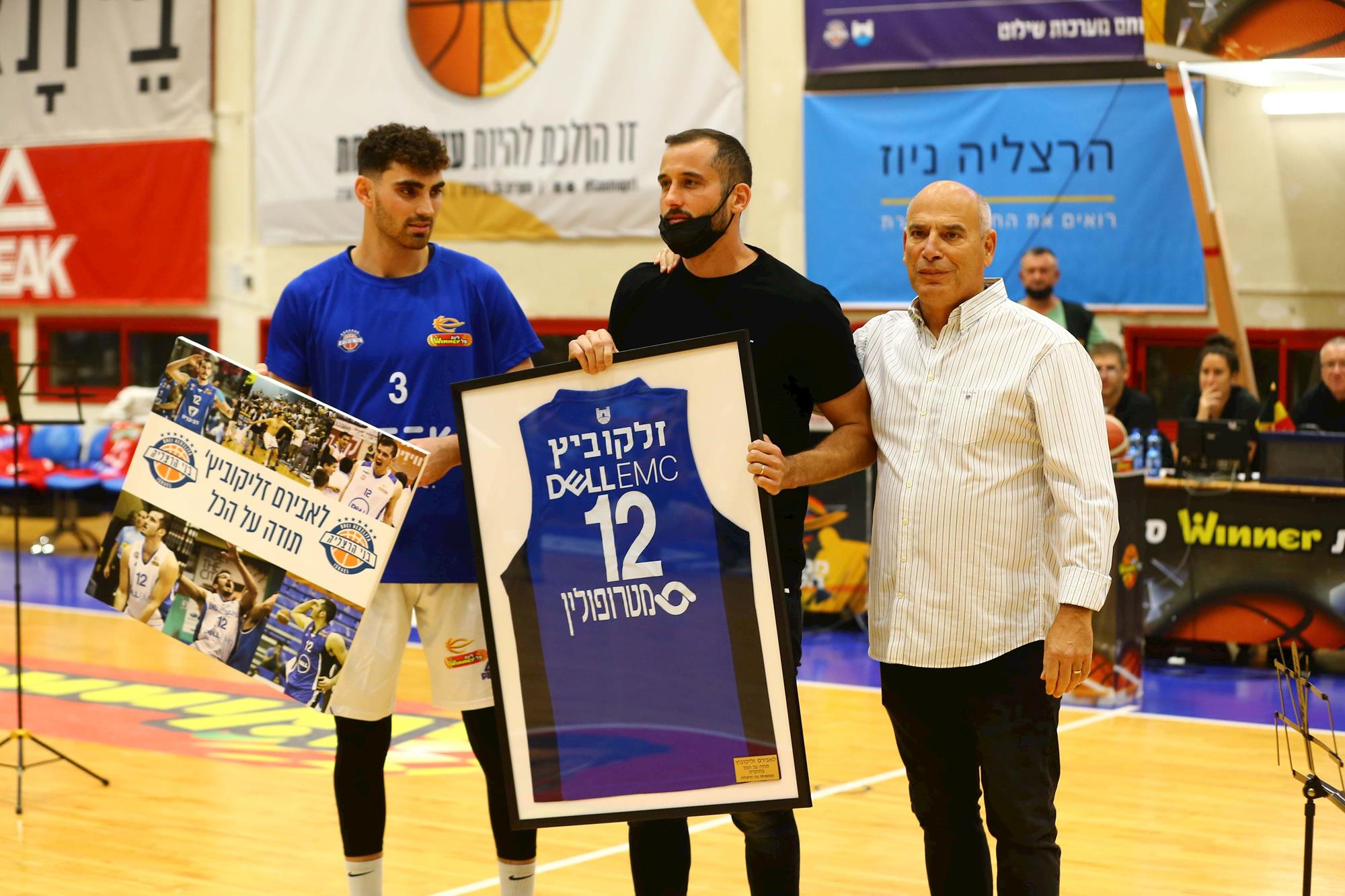 זליקוביץ' מקבל מהמנהל ברעם והקפטן קרביץ גופיה ממוסגרת וקולאז' (צילום: לירון מולדובן)