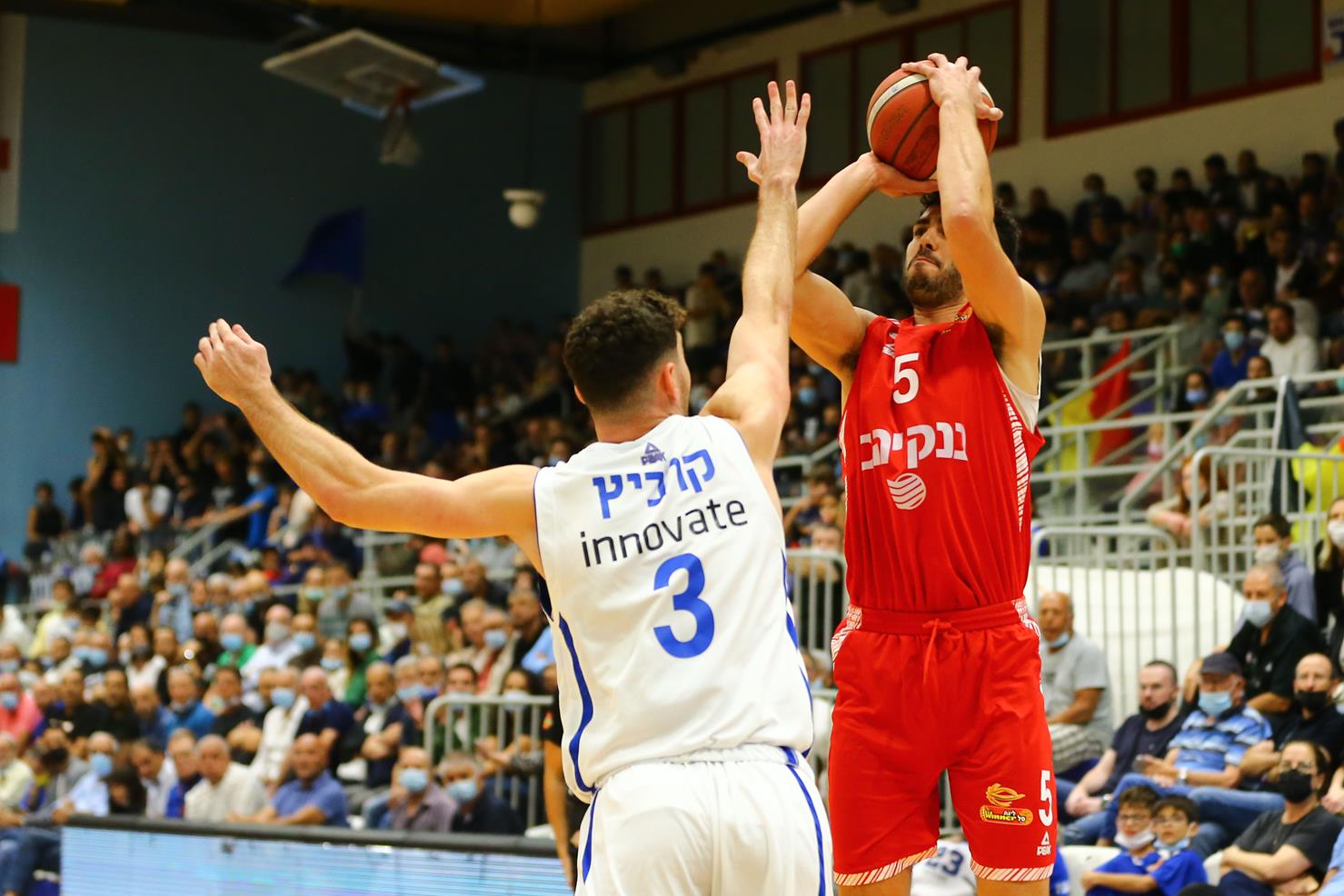 גרשון מנסה לקלוע מעל קרביץ (צילום: לירון מולדובן)