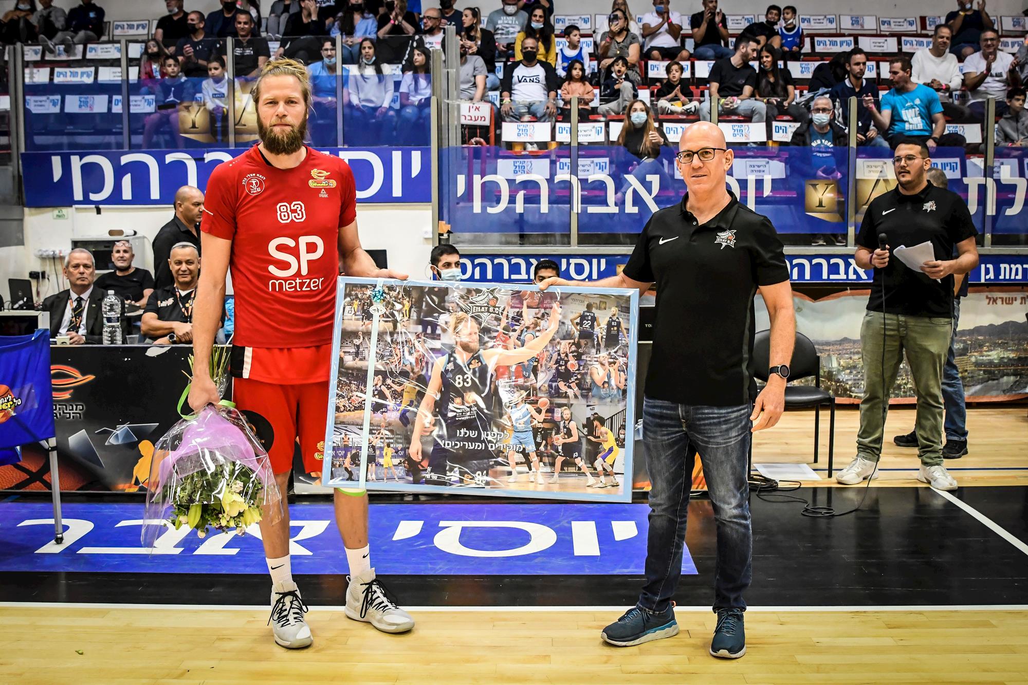 שולדבראנד קיבל מהמנכ"ל אורן אלמוג תשורה על שנותיו באילת (צילום: רז גליל)