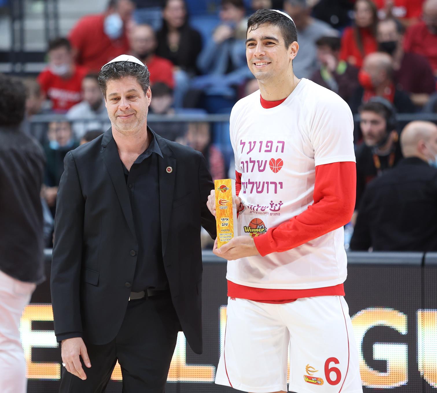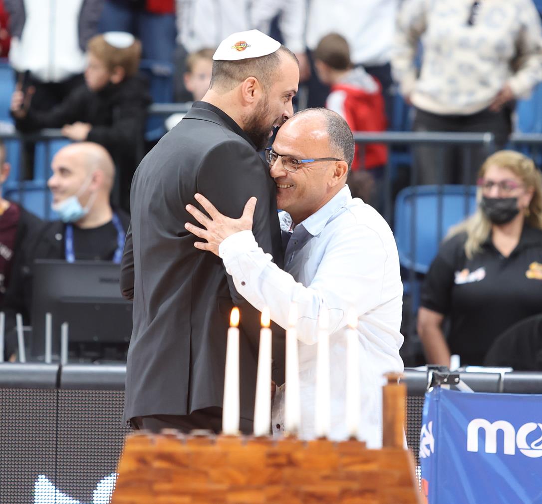 שגב מקבל מהמנהל בסן מגן על הגעתו ל-1,000 נקודות בליגת ווינר סל (צילום: דני מרון)