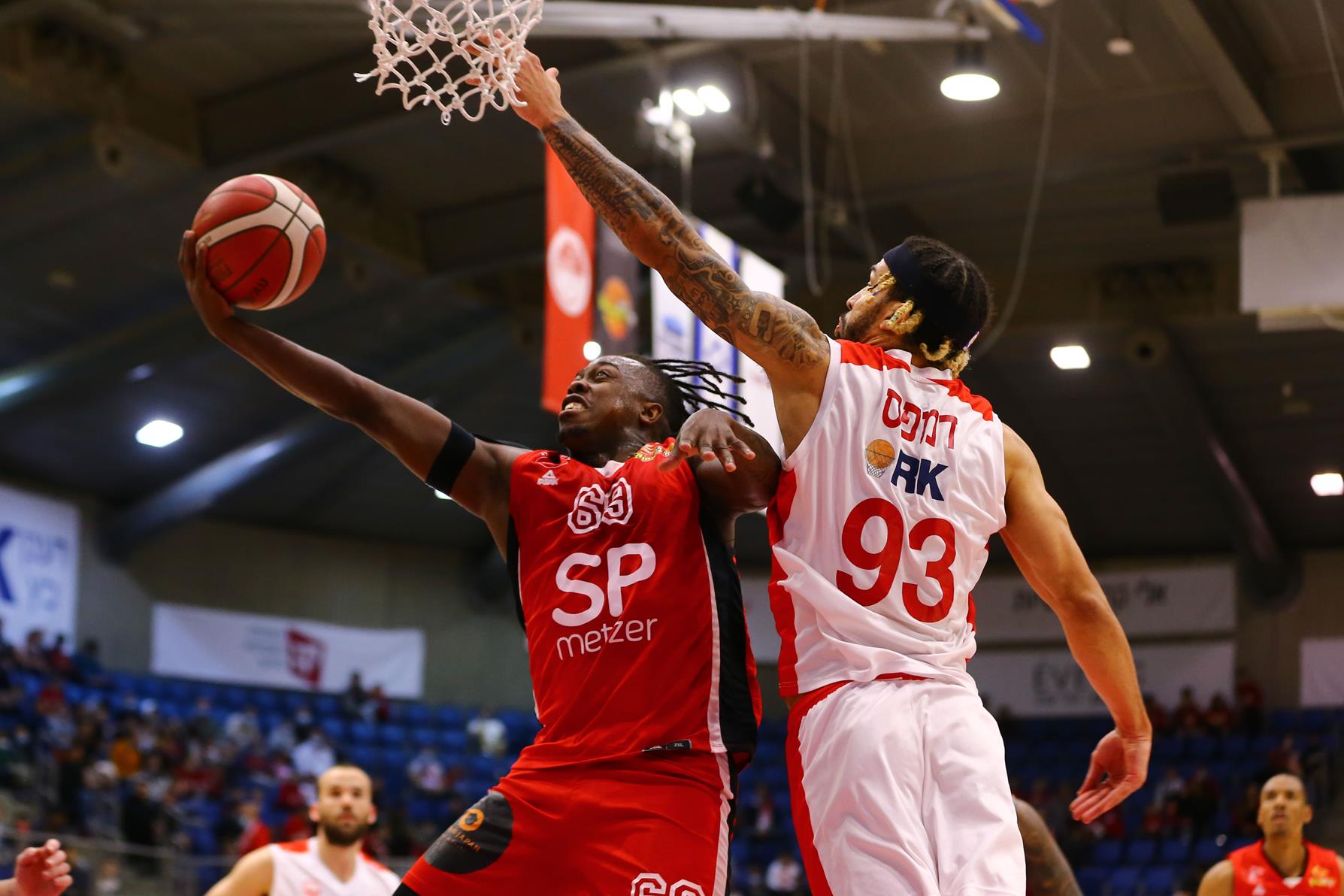 דמפס מנסה לעצור את בראון מתחת לסל (צילום: לירון מולדובן)