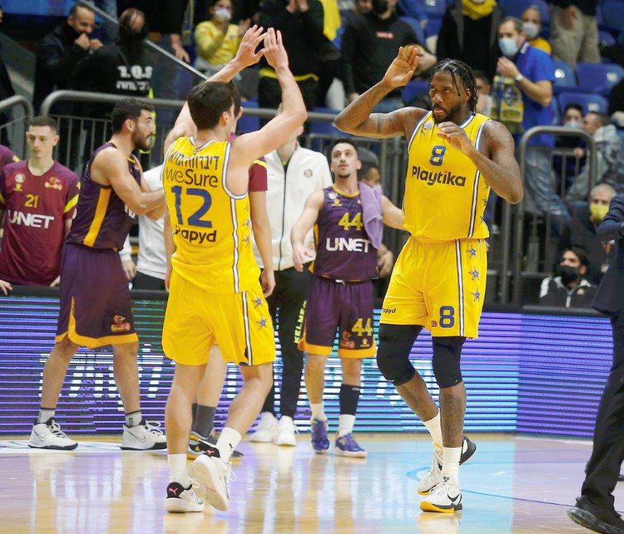 רבע רביעי מרשים של מכבי "Playtika" ת"א בהגנה סידר לה מהפך מול הפועל "יונט" חולון, 79:80. אוואנס הצטיין, אבן ולוי הדריכו את הצהובים (צילום: אלן שיבר)