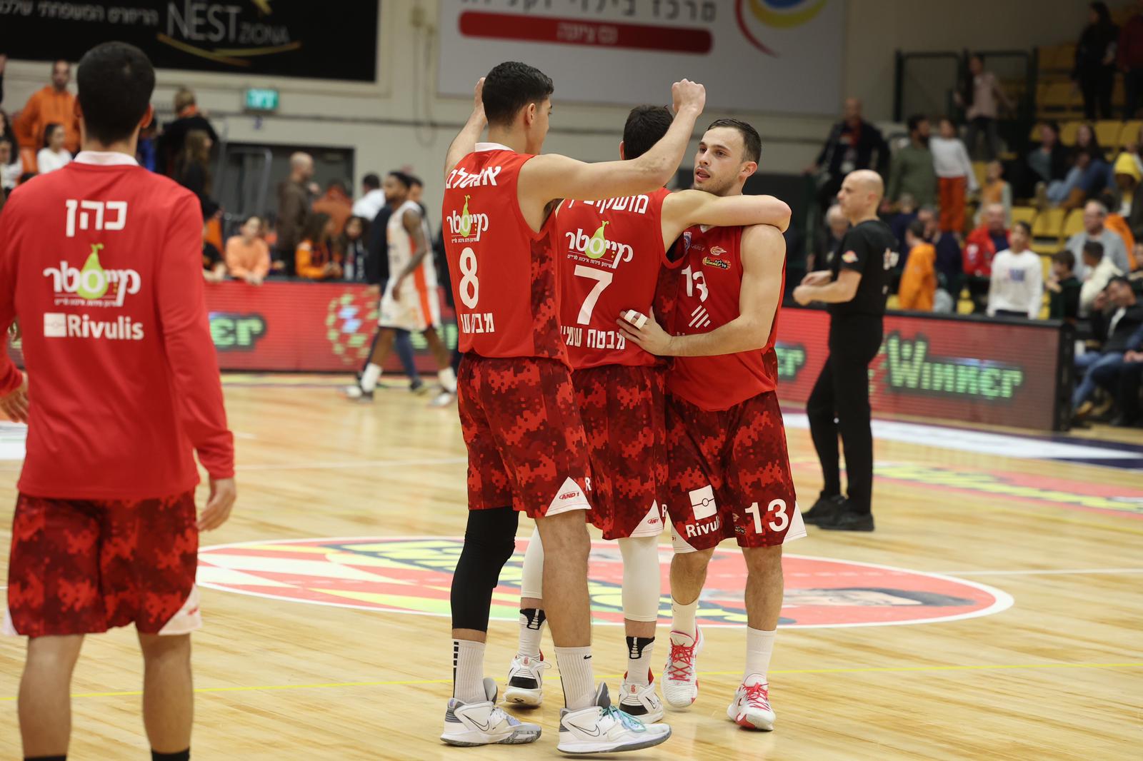 הובר, מושקוביץ ואמסלם חוגגים ניצחון חשוב (צילום: גיל נוימן, הפועל גליל עליון)