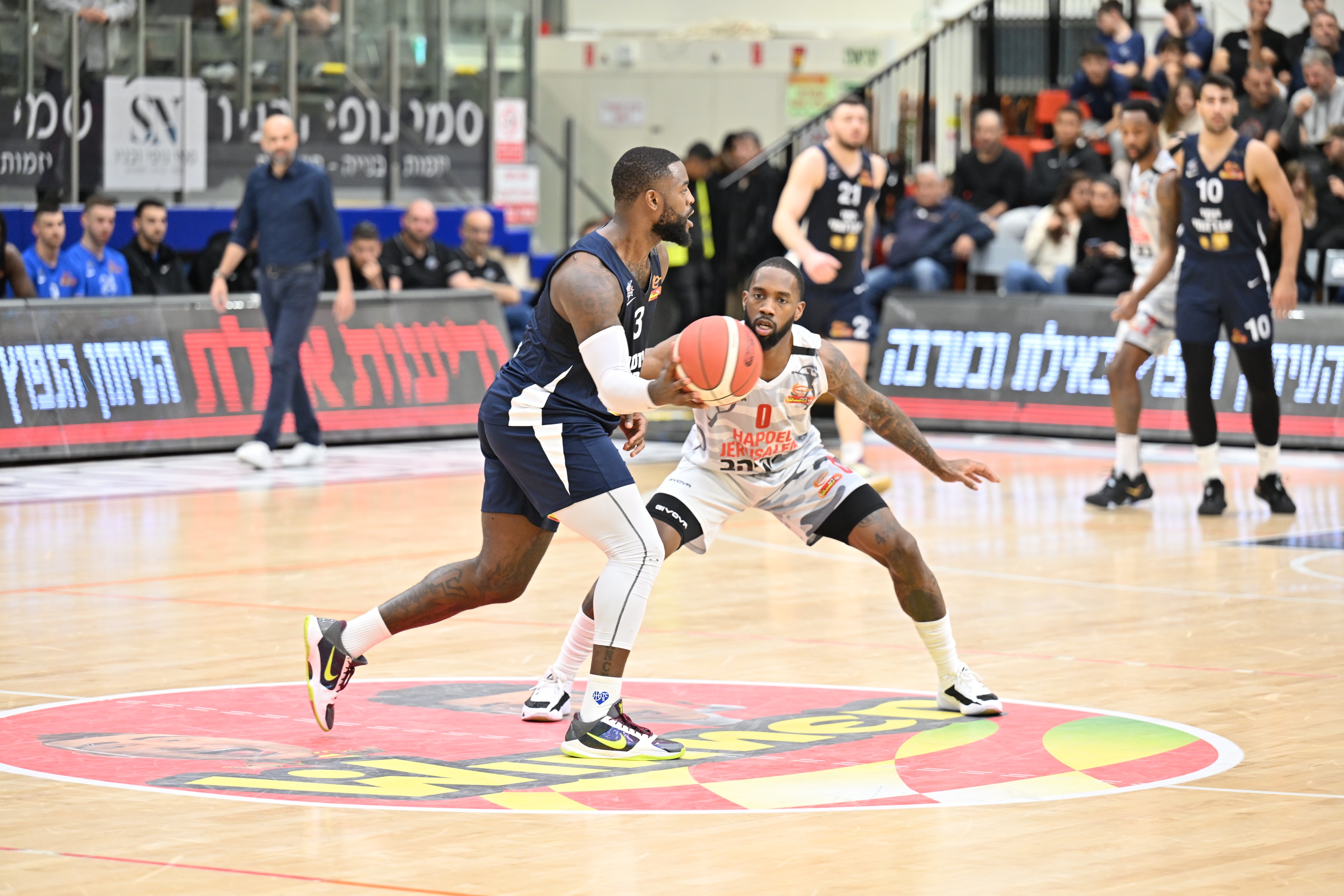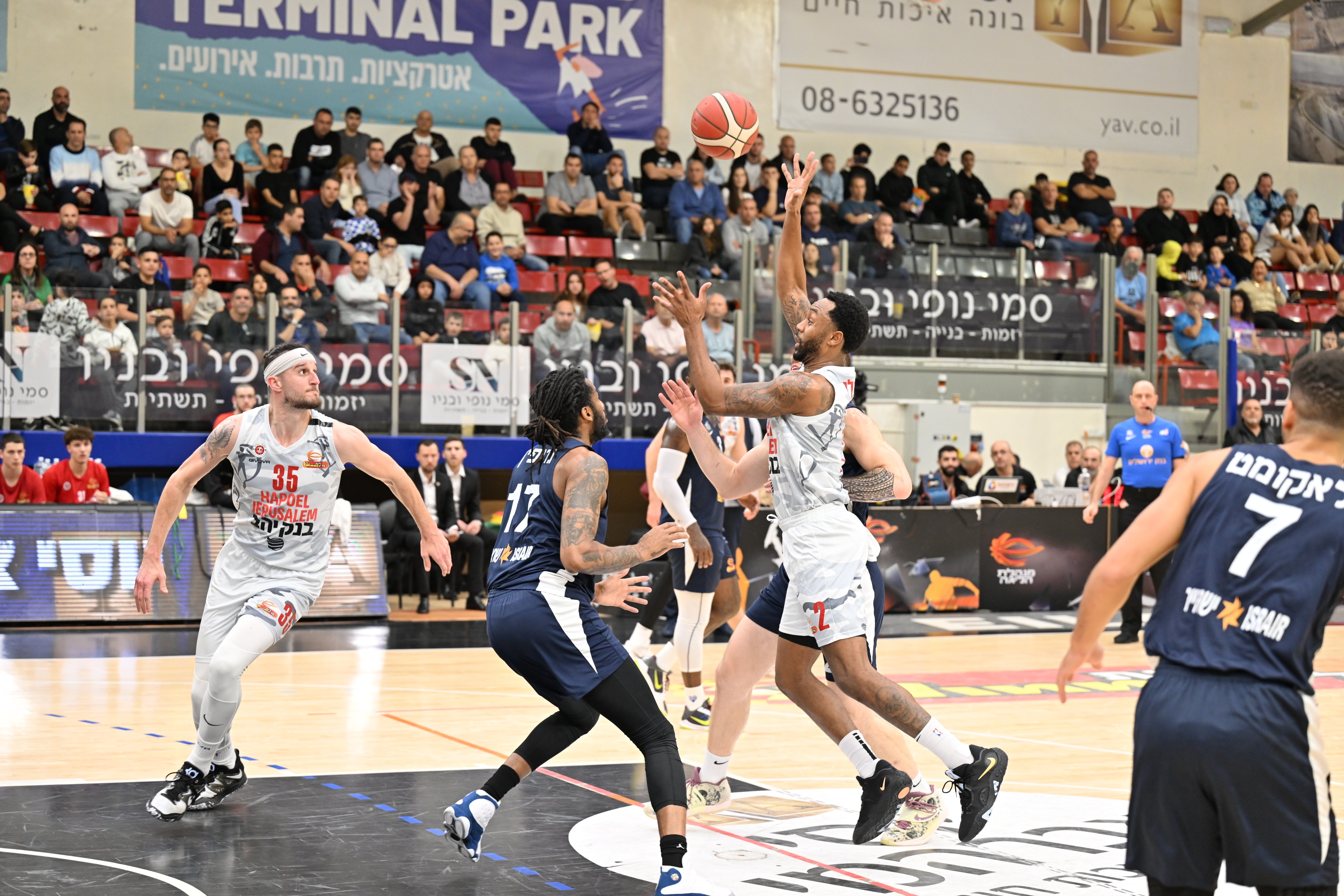 הפועל "בנק יהב" ירושלים עלתה זמנית למקום הרביעי בטבלה עם 60:83 על הפועל "יוסי אברהמי" אילת. מופע הטבעות ודאבל-דאבל לזאק הנקינס (צילום: יוד צילומים)