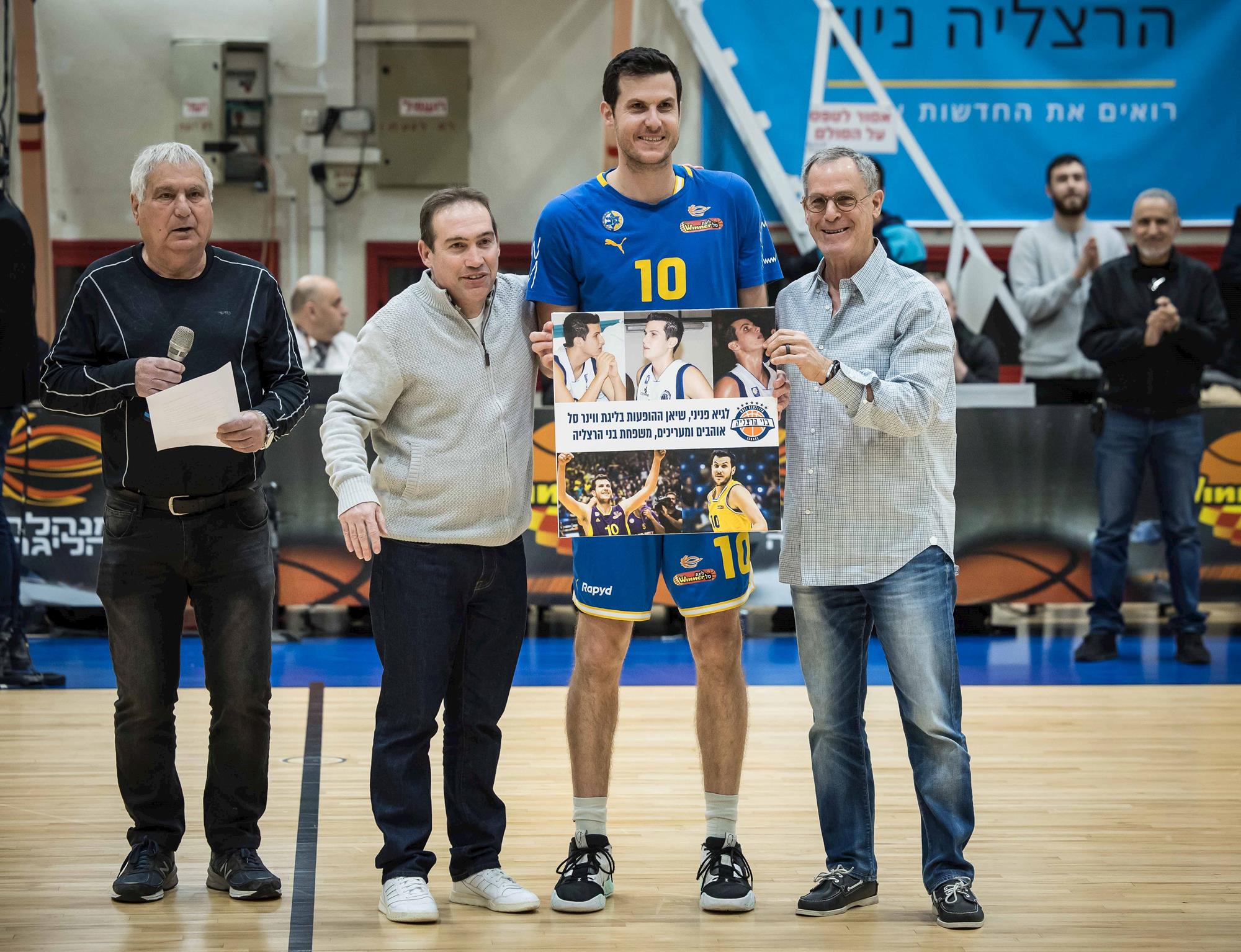 פניני מקבל תשורה מהבעלים רקנאטי והיו"ר אקוניס על שבירת שיא ההופעות (צילום: עודד קרני)