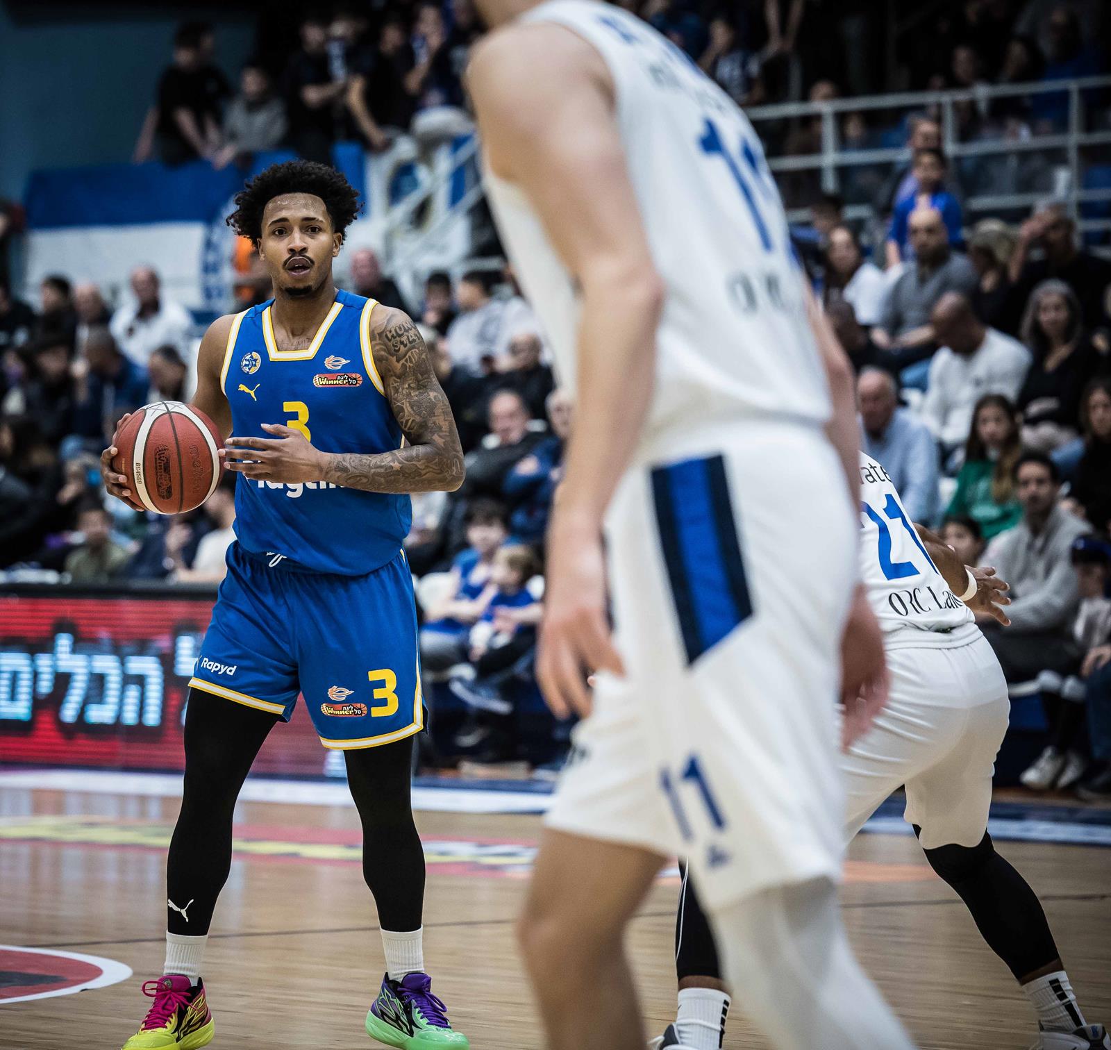 תומפסון ג'וניור חוגג את שלשת הבכורה בלבן-כחול (צילום: עודד קרני)