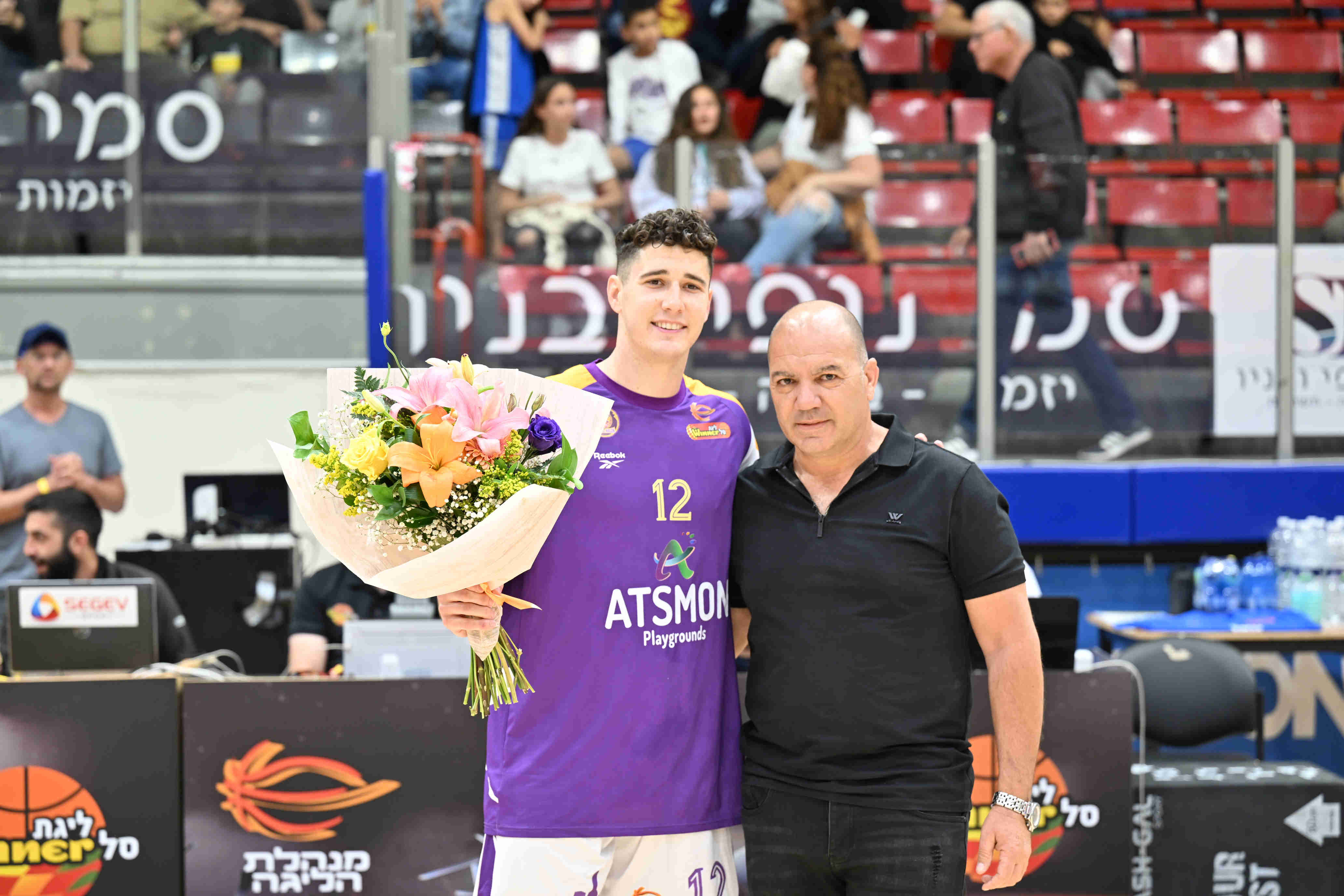 עמיר האילתי התקבל בפרחים לפני המשחק (צילום: יוד צילומים)