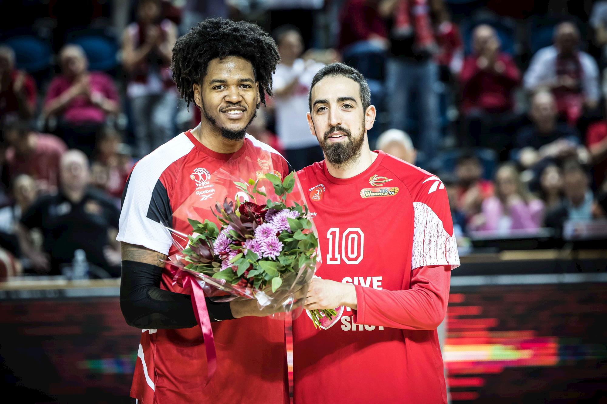 טילמן מקבל פרחים מטימור על תקופתו בהפועל ת"א (צילום: עודד קרני)
