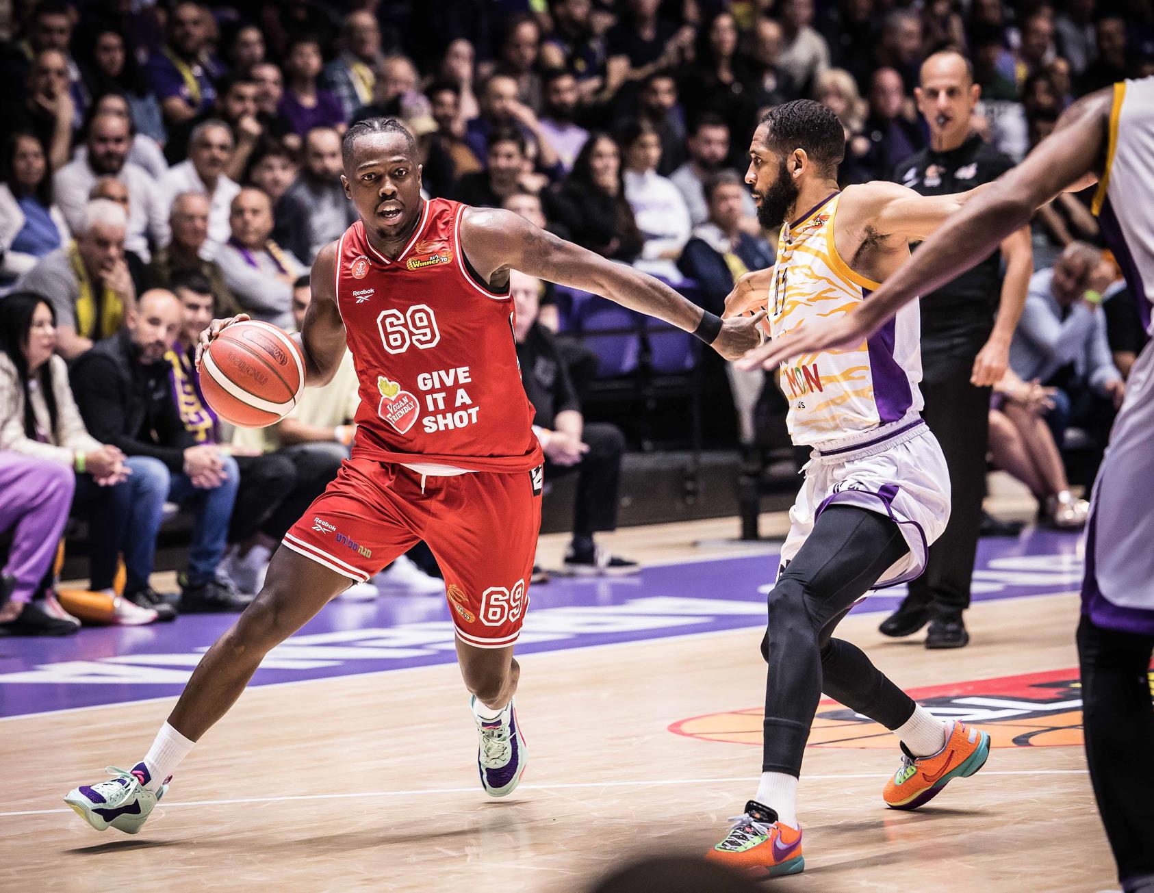 סגול נגד אדום ביציעי היכל טוטו (צילומים: עודד קרני)