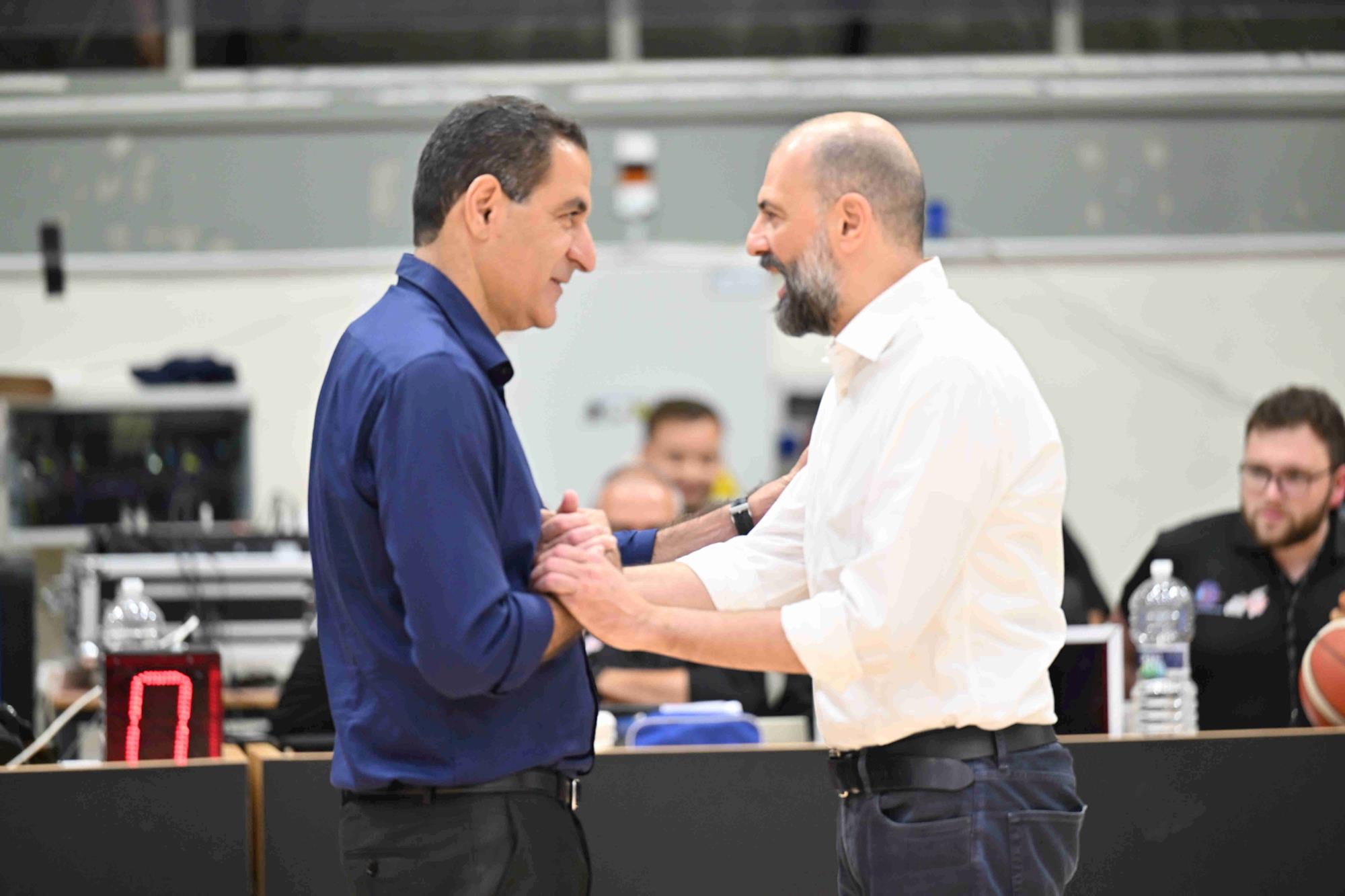 בוסקאליה ואהרוני לוחצים ידיים לפני המשחק (צילום: יוד צילומים)
