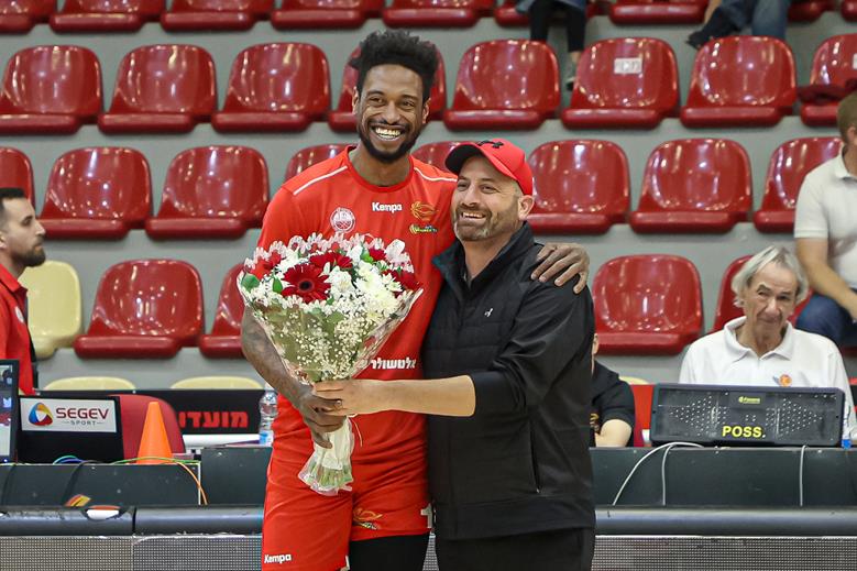 וויטינגטון מקבל פרחים ממנכ"ל גלבוע, ארצי פרטי, טרם המשחק (צילום: לילך וייס-רוזנברג)