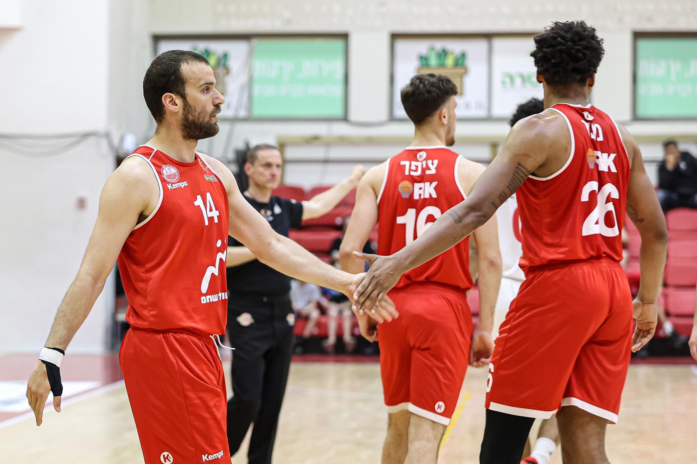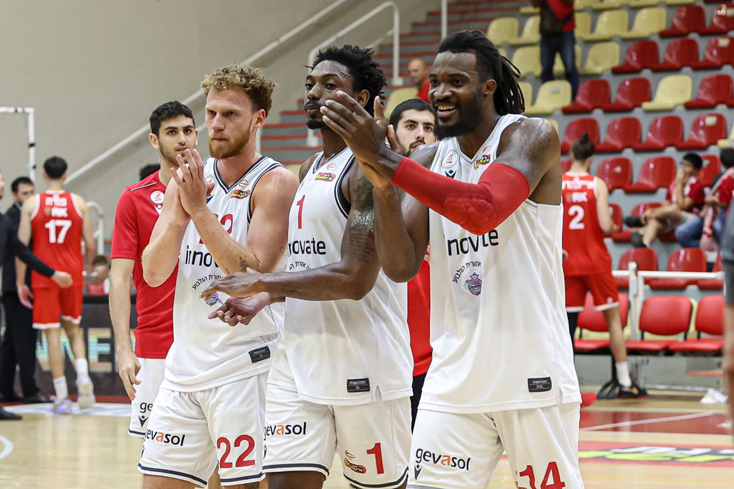 בראון, פרנקס וזיס חוגגים ניצחון ביתי אחרון בליגת ווינר סל (צילום: לילך וייס-רוזנברג)