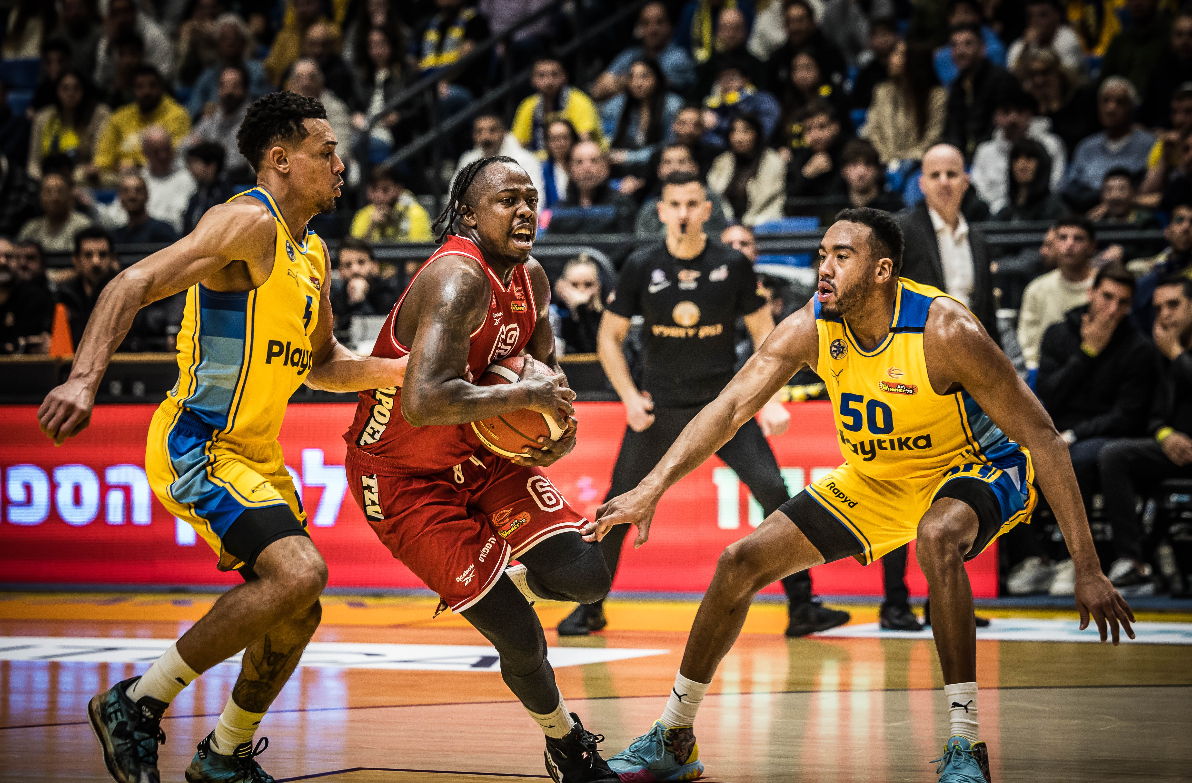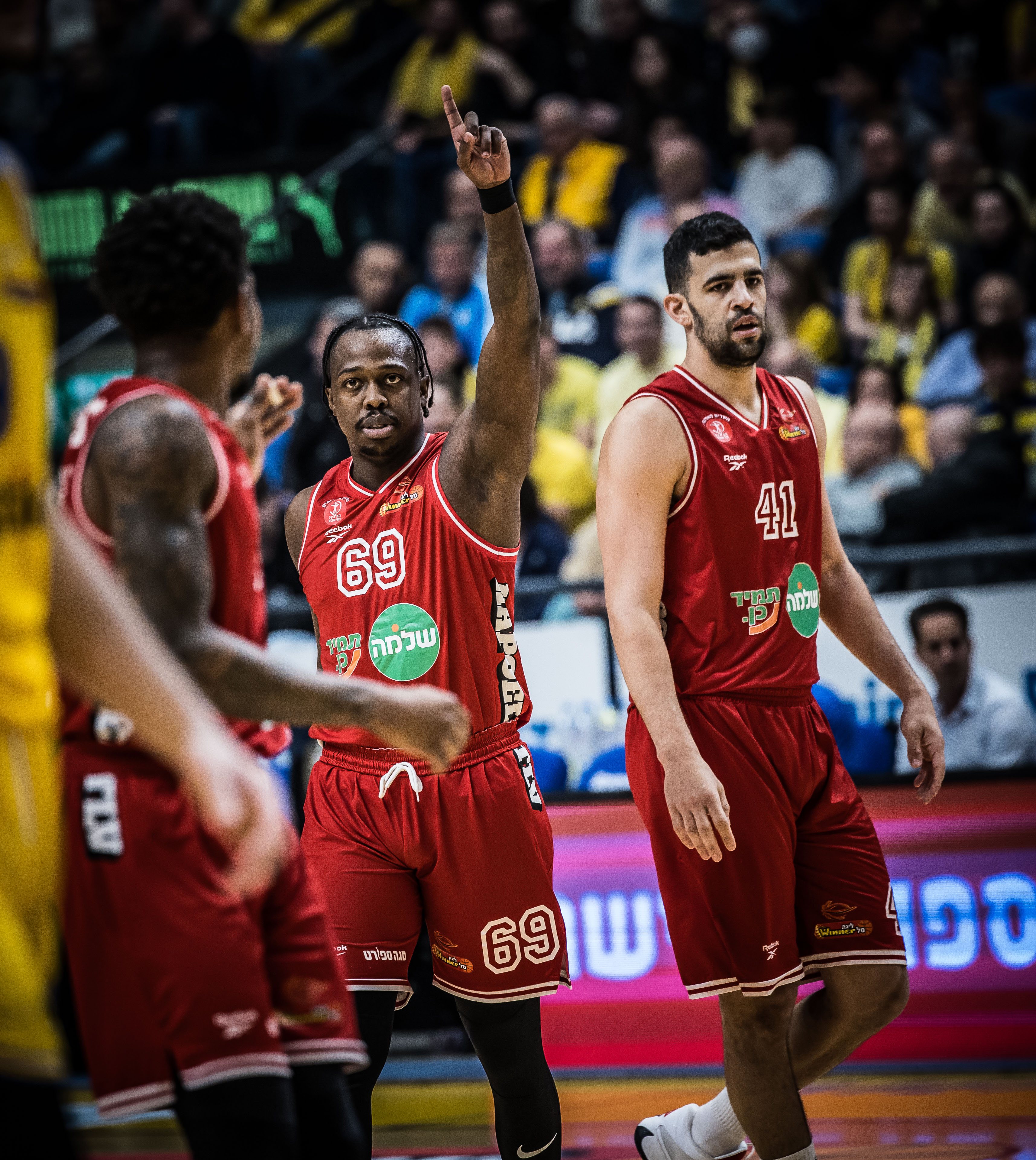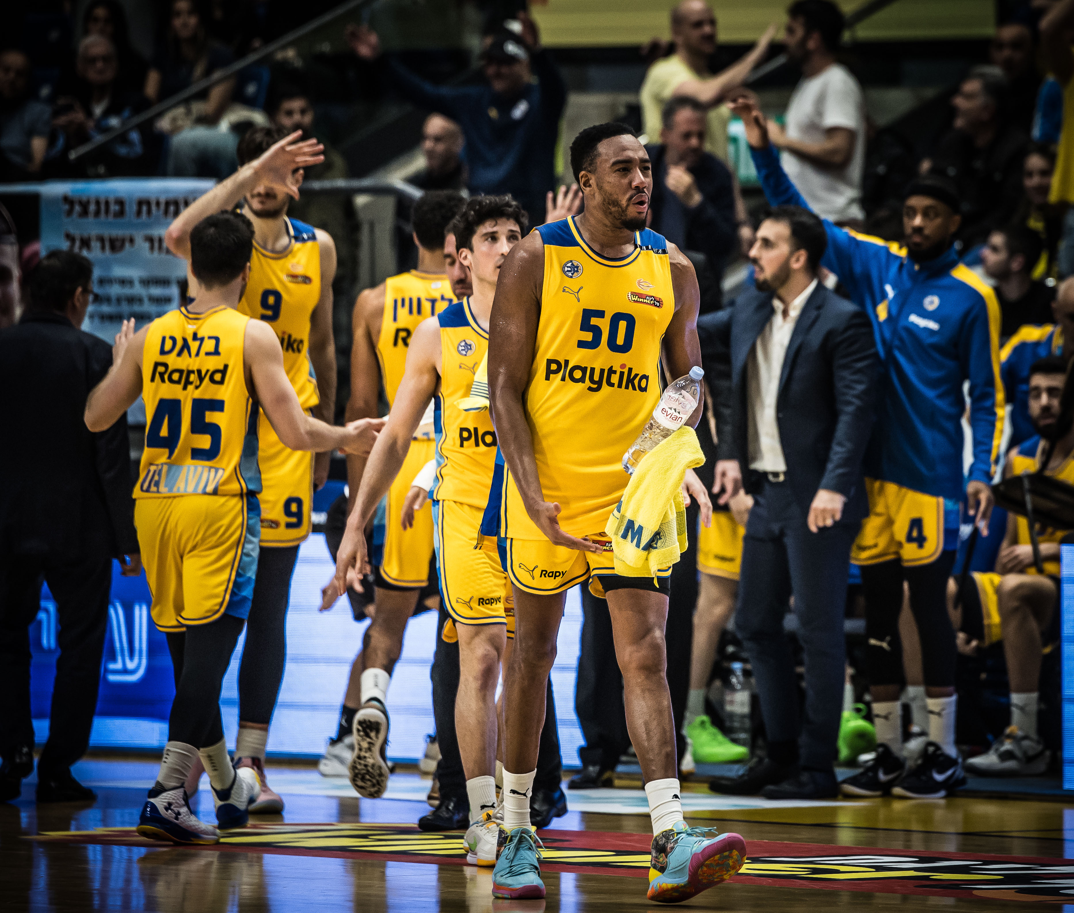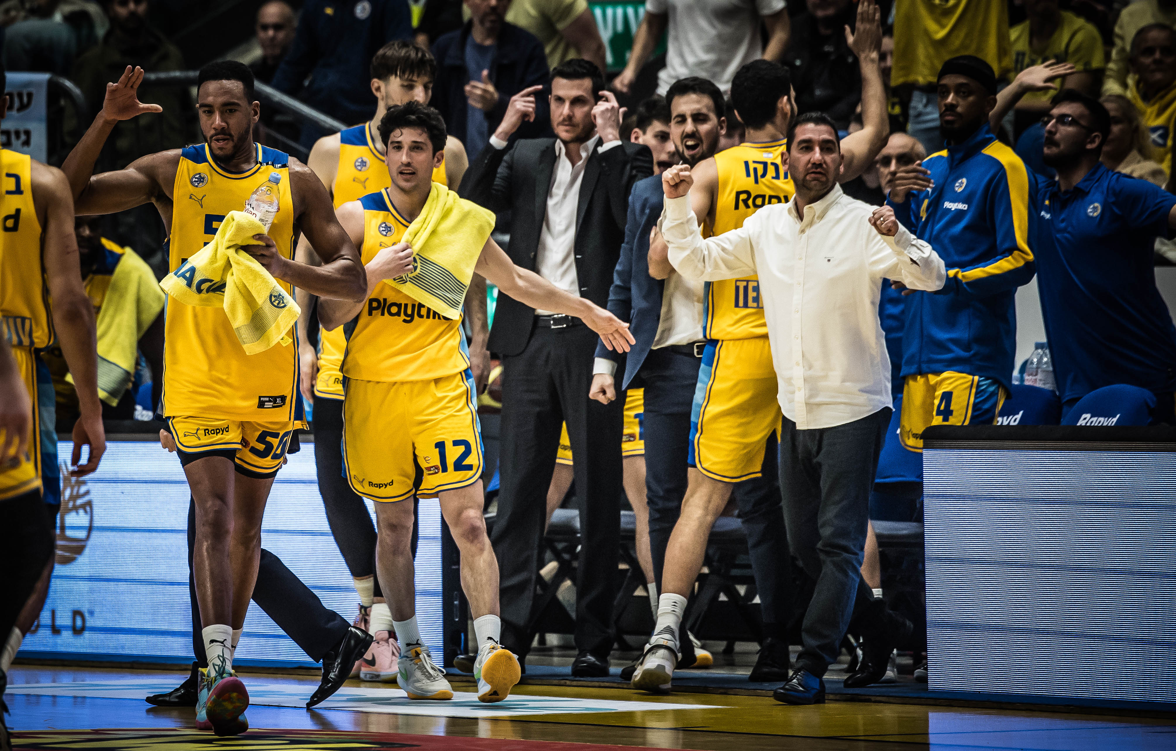 האלופה התחילה בגמגום מסוים ומצאה את עצמה בפיגור 9, אלא שאז המחליפים שלה נכנסו לפעולה: חסיאל ריברו עלה מצוין מהספסל במקום ג'וש ניבו שהסתבך בבעיית עבירות, ג'ון דיברתולומיאו נתן את האנרגיות והשלשות המוכרות וג'ייק כהן הוביל את המהפך ברבע השני עם 7 נקודות רצופות. בונזי קולסון ו-ווייד בולדווין הובילו את ההתקפה המאוזנת בצהוב-כחול, רומן סורקין תרם בספרות כפולות וגם הקפיץ את הקהל בכמה חסימות. מכבי ת"א תנסה להמשיך את המומנטום בהמשך השבוע במשחקי צמרת בבית מול ר"ג ובחוץ מול ירושלים.