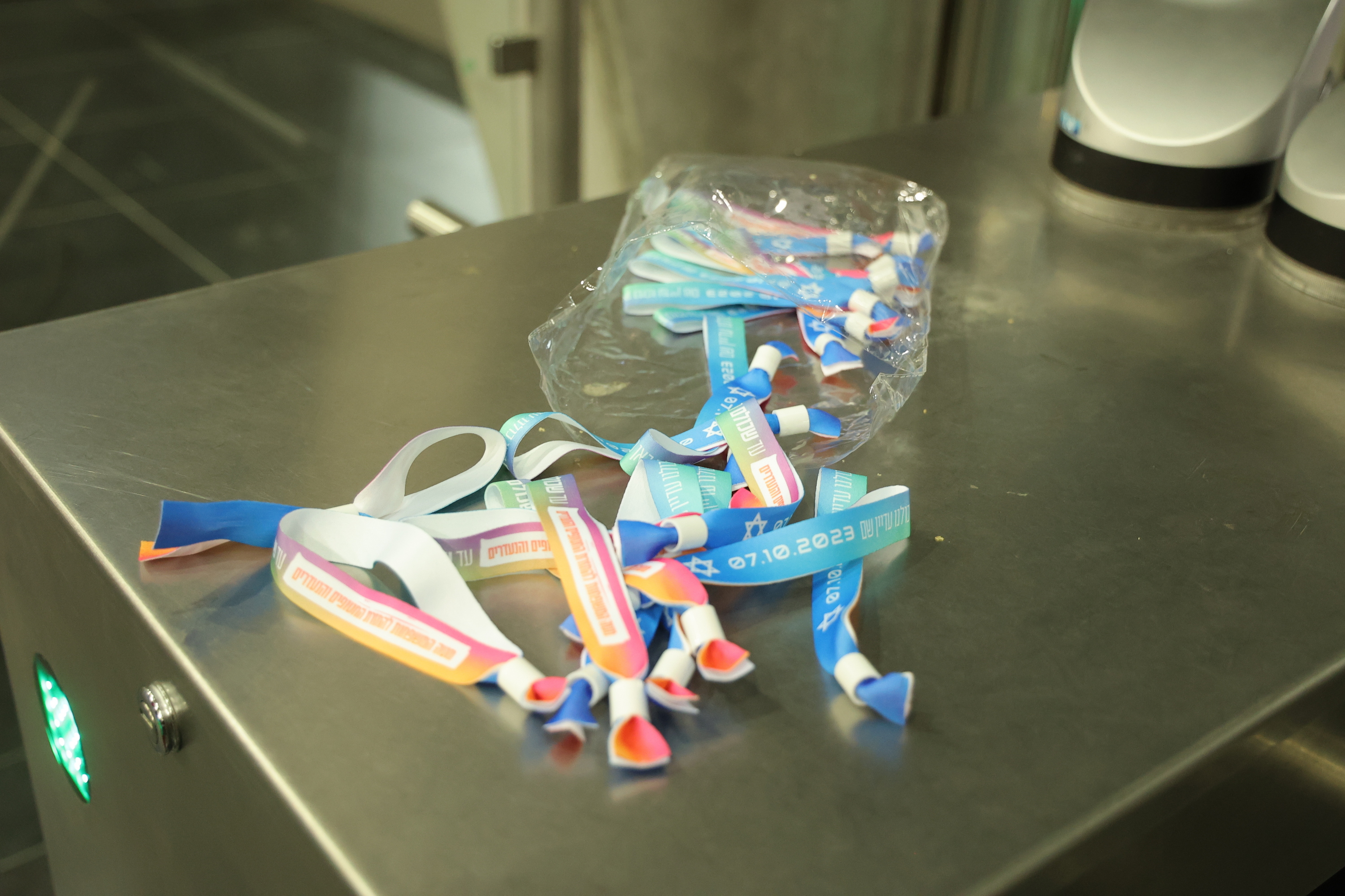 בכניסה לקונכיה: חלוקת צמידים של מטה החטופים (צילומים: מרטין גוטדאמק)