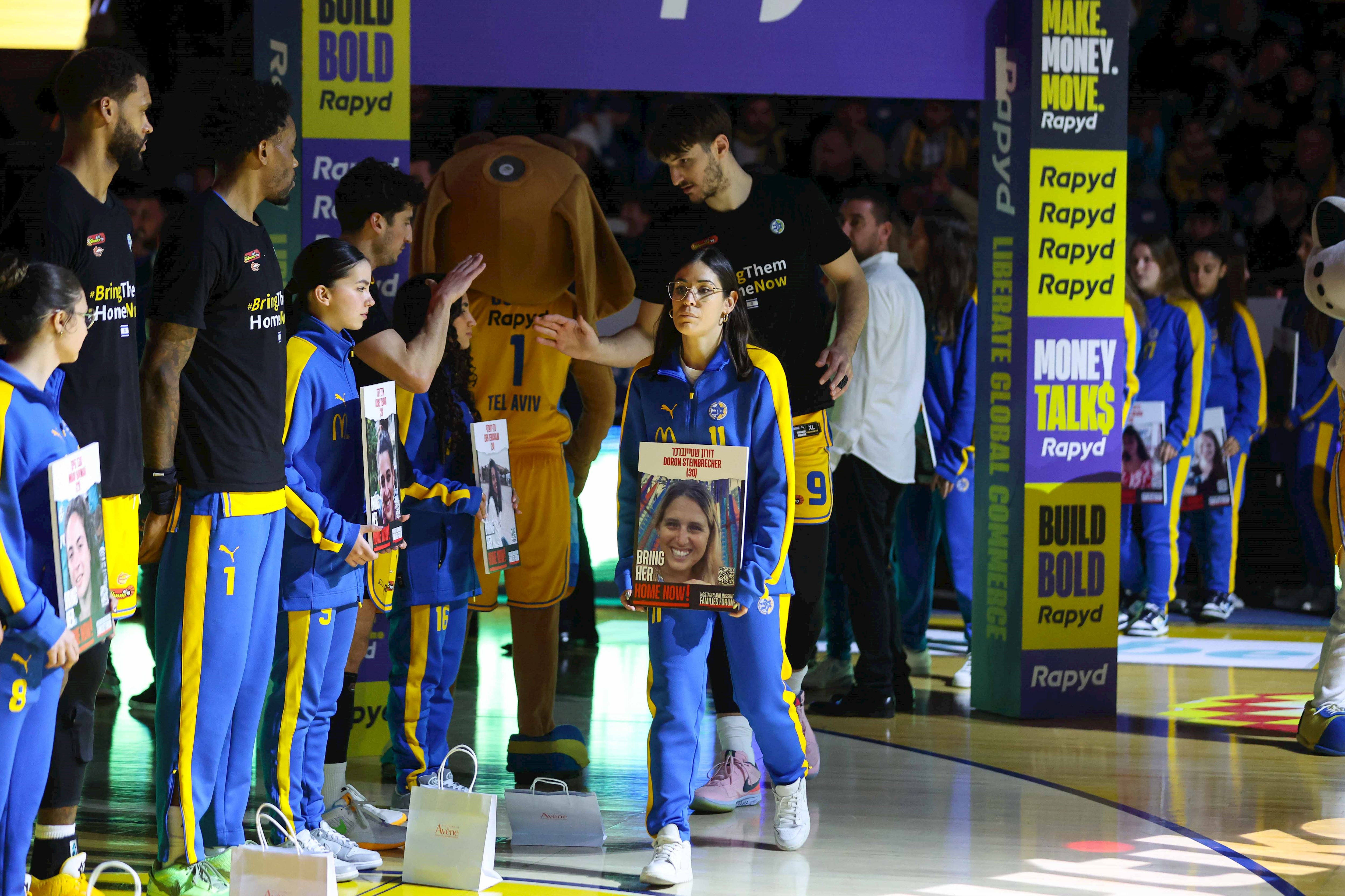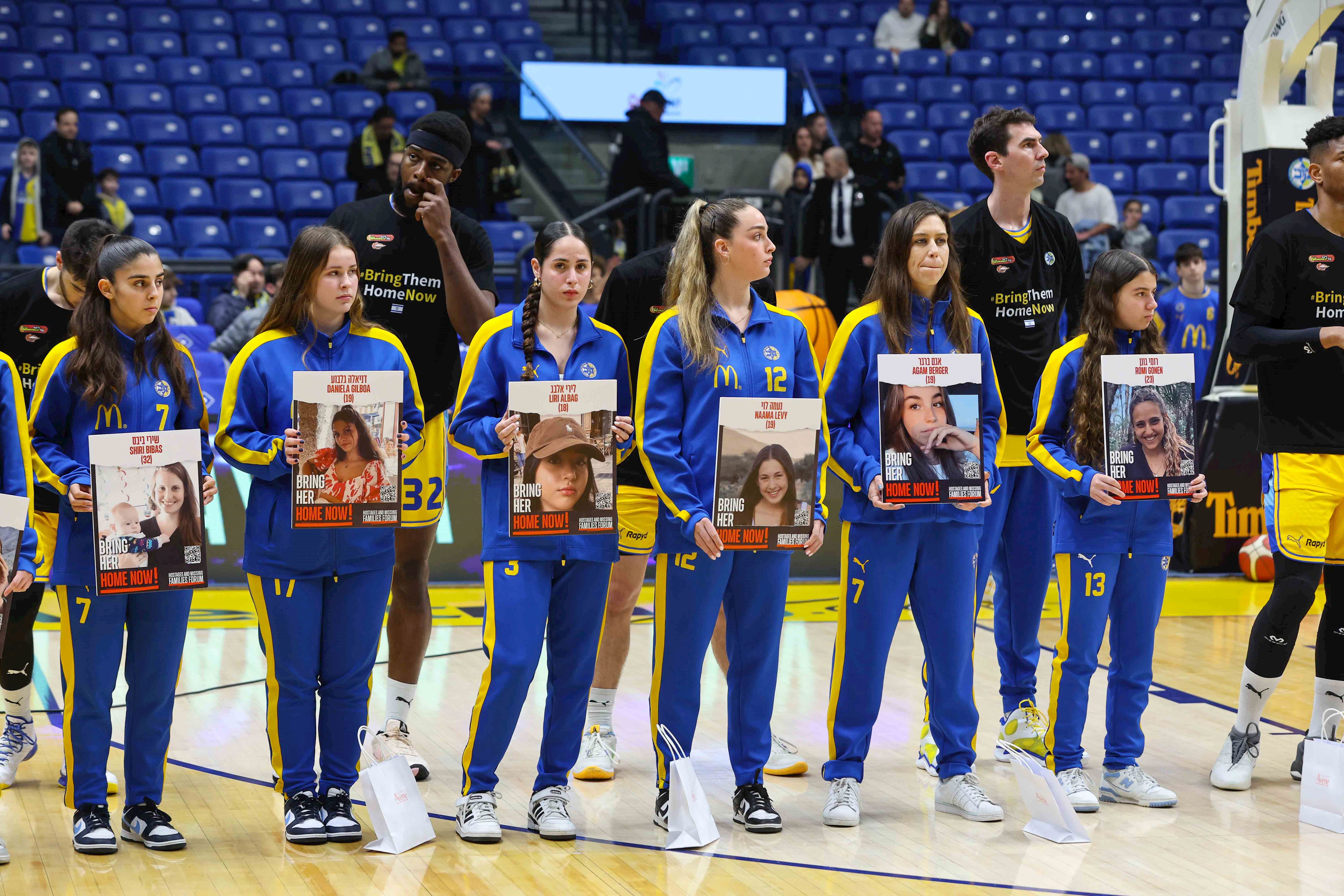 שחקניות קבוצת הנשים וקבוצת הנערות של מכבי ת"א מחזיקות בתמונות הנערות והנשים החטופות (צילומים: לירון מולדובן)