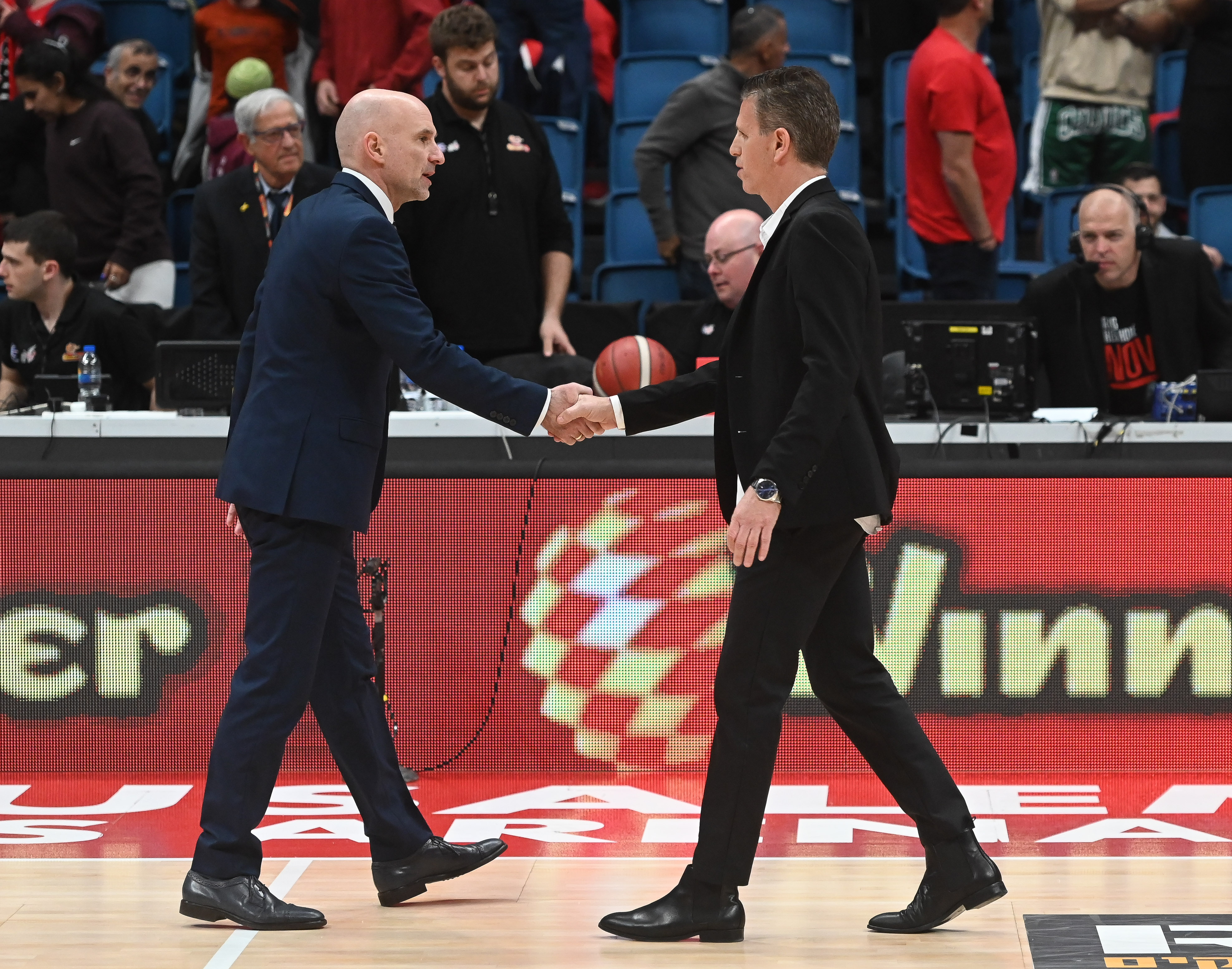 אברהמי וקאנצוריס לוחצים ידיים בפתיחה. מפגש שני בין המאמנים (צילום: ברני ארדוב)