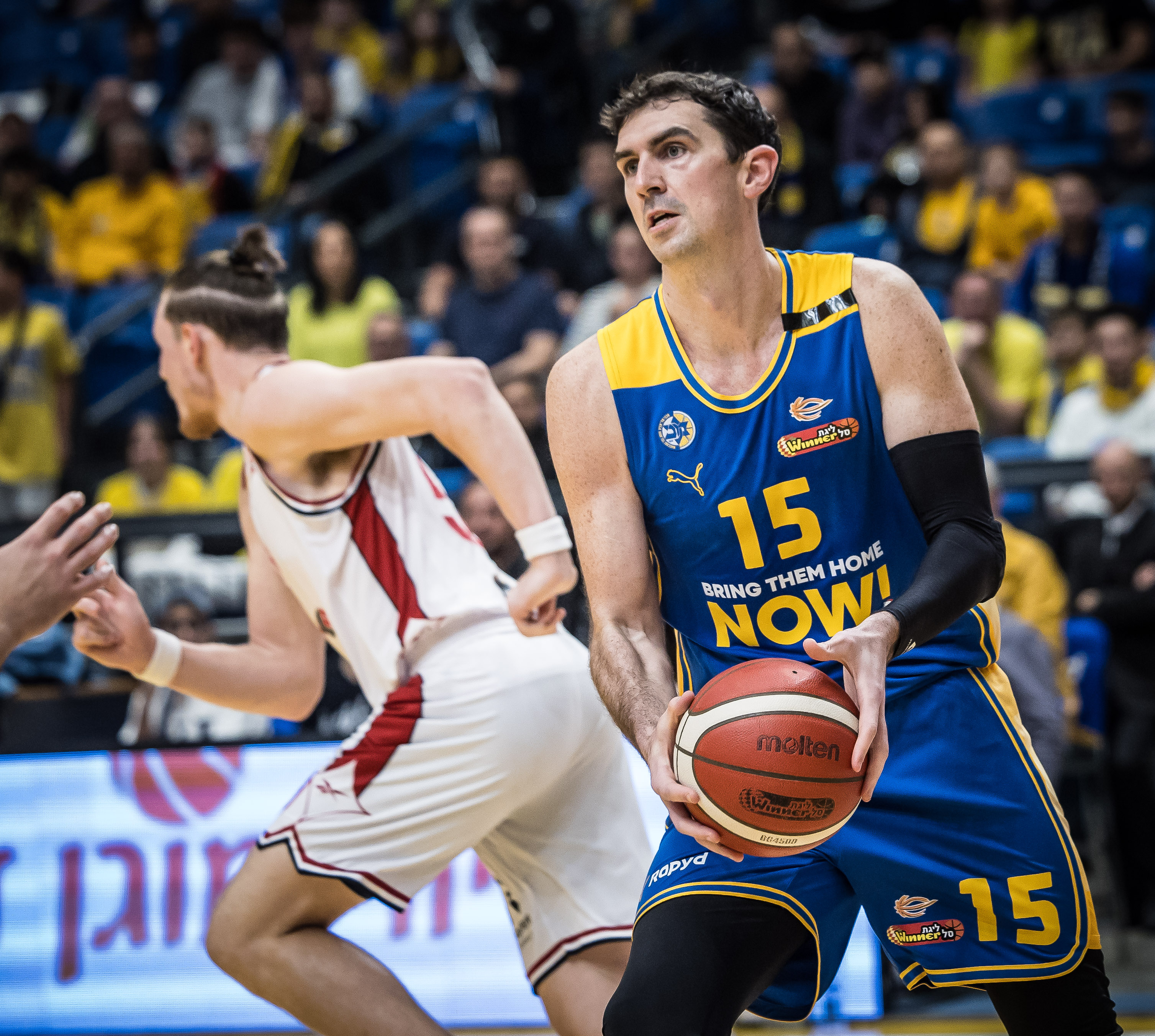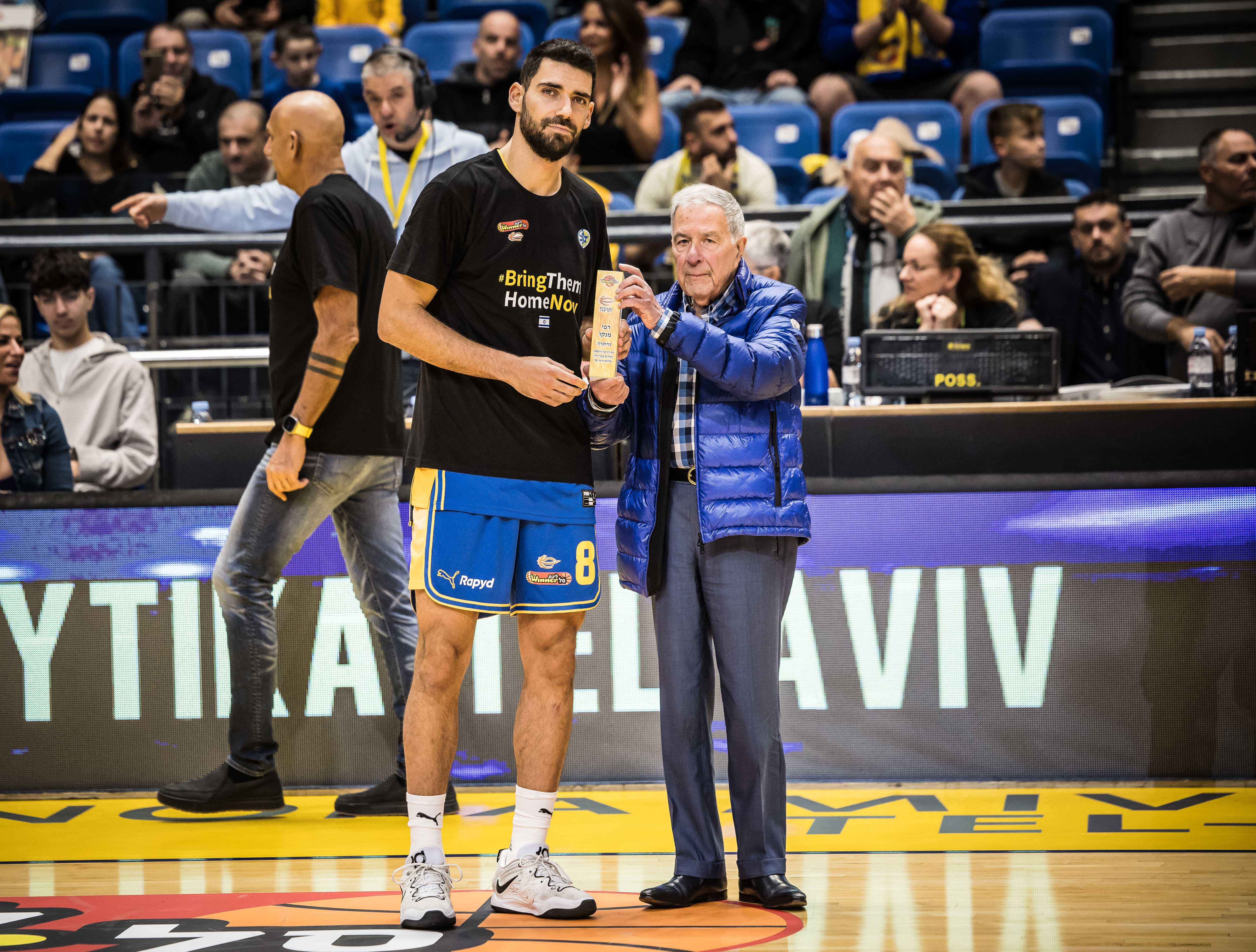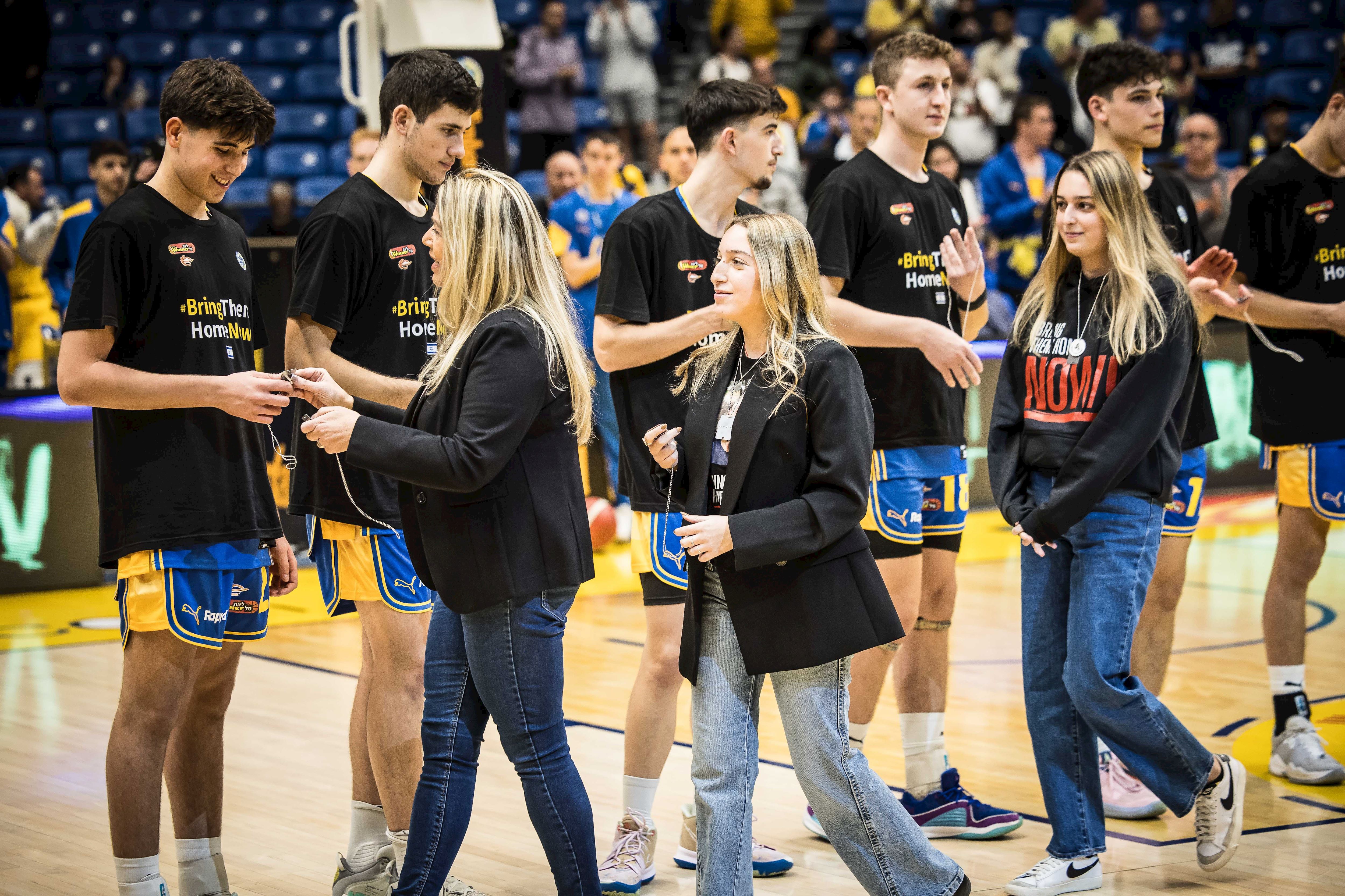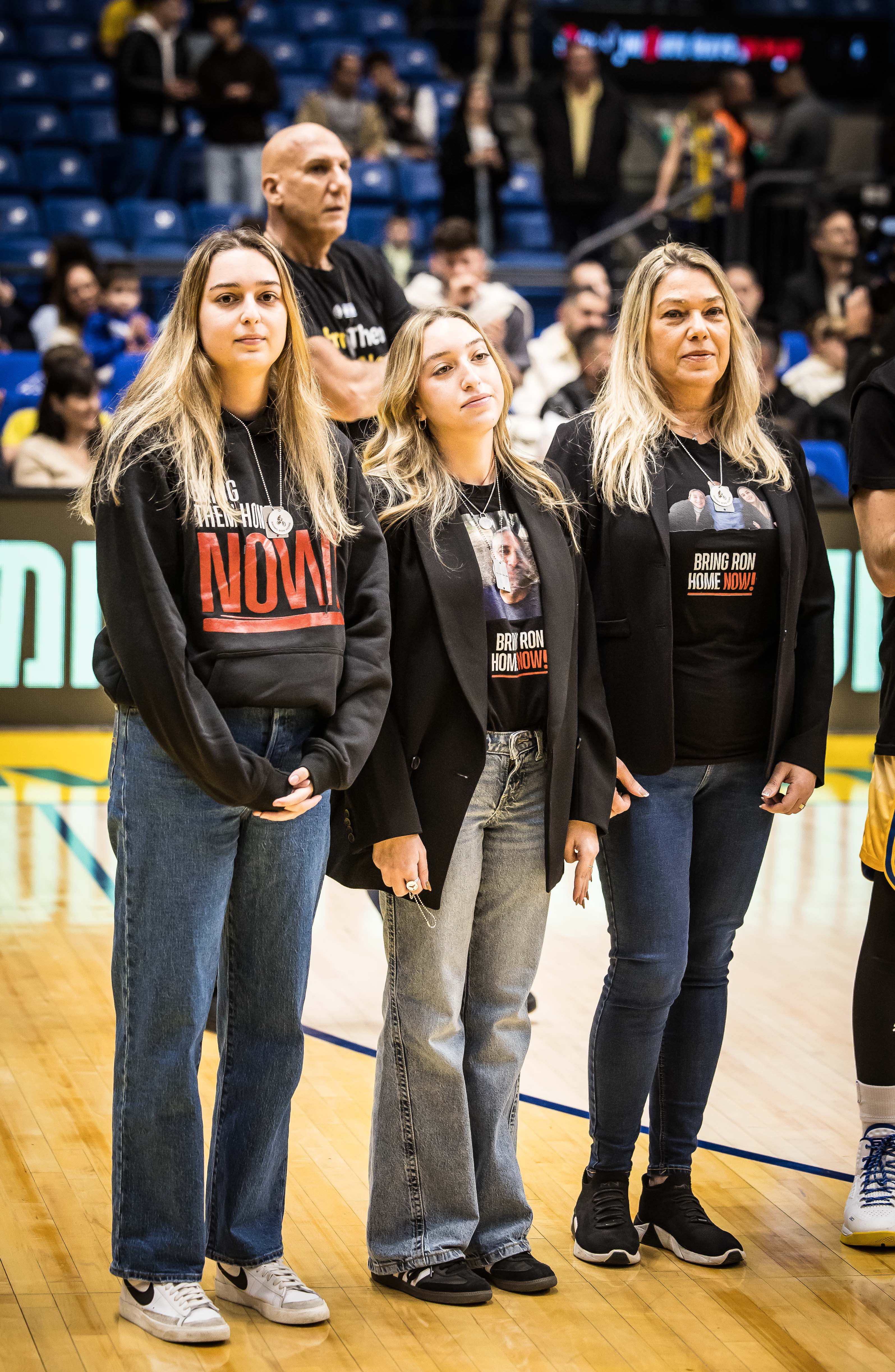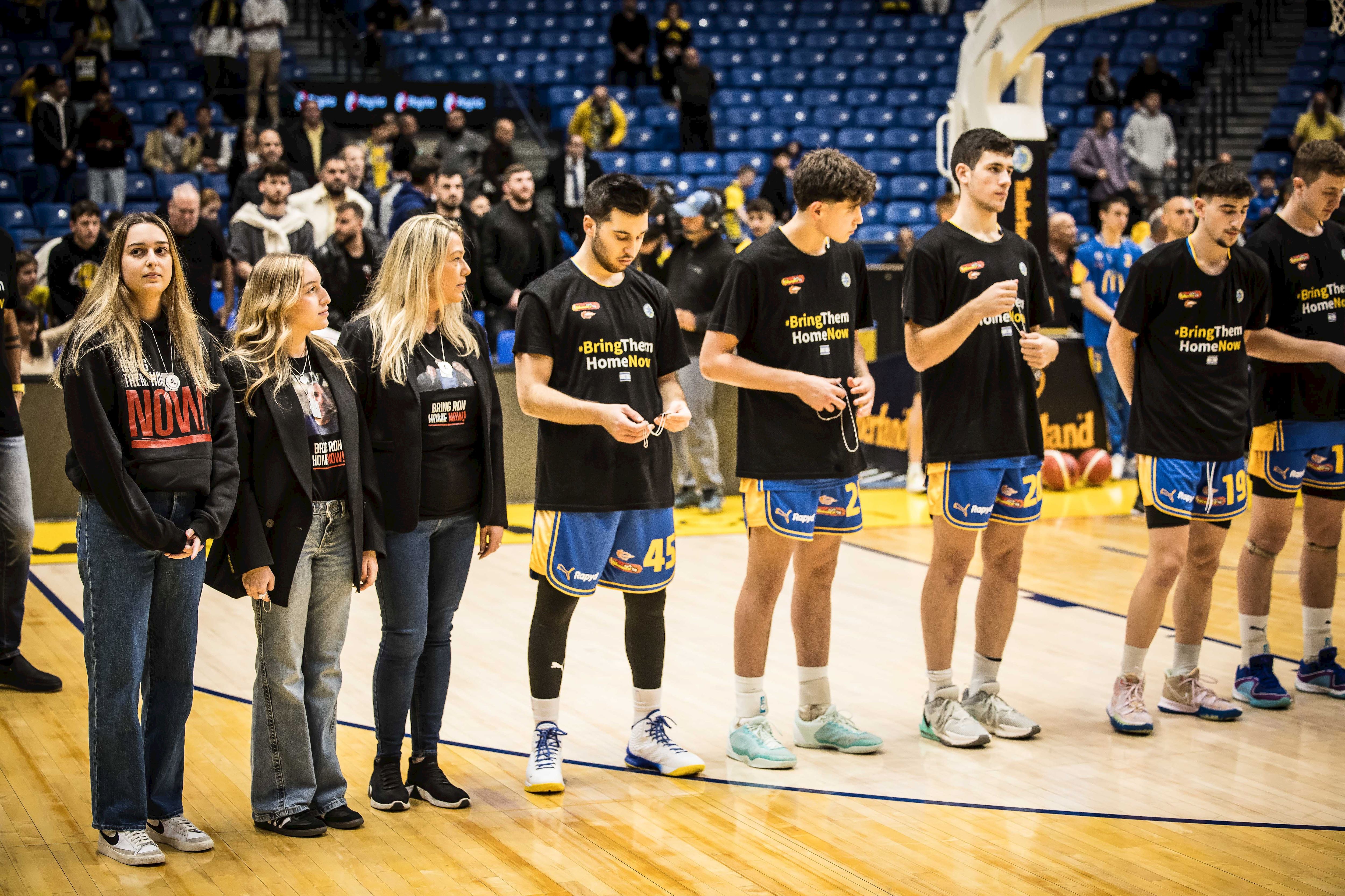 למשחק הערב בהיכל מנורה מבטחים הגיעו איילת בנימין והבנות שי וגיל, שבאו להזכיר כי אבי המשפחה רון בנימין עדיין חטוף ברצועת עזה. רון, שיצא באותו בוקר ארור של 7 באוקטובר עם חבריו לרכוב על אופניים באיזור מפלסים, הוגדר נעדר במשך 57 ימים לפני שהתברר כי הוא חטוף. איילת, שי וגיל חילקו לשחקני מכבי ת"א שתי דיסקיות - האחת בקריאה להשבת כל החטופים והשנייה מוקדשת לרון.