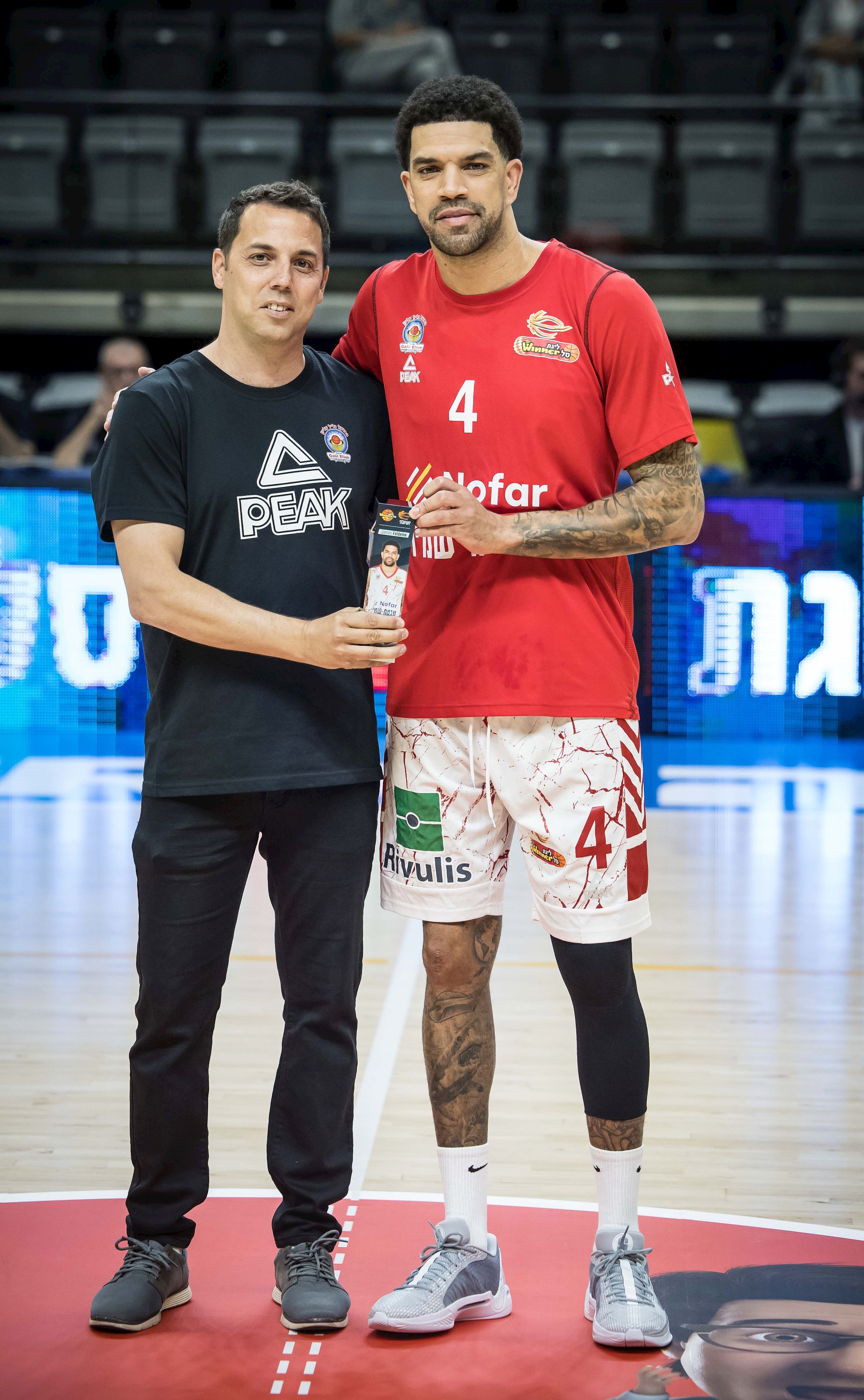 פלדין קיבל מיושב הראש אברהמס מגן על הגעתו ל-1,000 נקודות בליגת ווינר סל (צילום: עודד קרני)